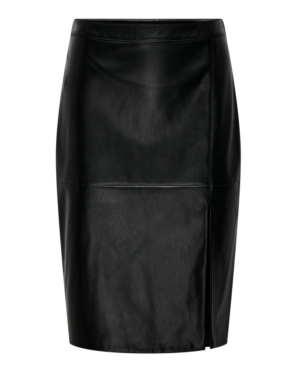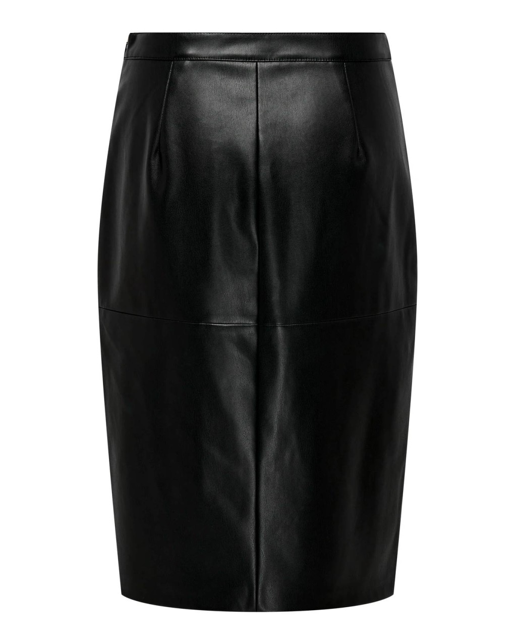 La gonna è realizzata in ecopelle nera, con una superficie liscia e leggermente lucida che le conferisce un aspetto elegante e moderno