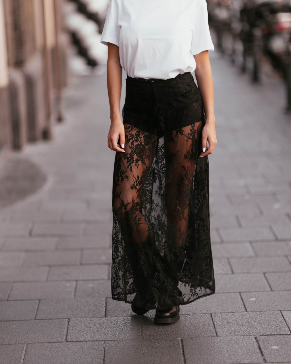 Elegante gonna lunga in pizzo floreale trasparente, caratterizzata da una raffinata texture con motivi ricamati su tutta la lunghezza. Il design a vita alta e il taglio svasato creano una silhouette femminile e romantica. Realizzata in pregiato pizzo con fodera interna, questa gonna si adatta perfettamente a occasioni speciali ed eventi serali.