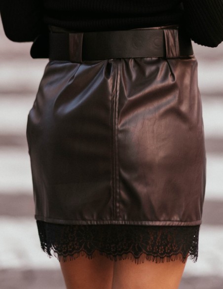 ●Elegante minigonna in ecopelle dalla vestibilità aderente, impreziosita da un raffinato bordo in pizzo sulla parte inferiore. Il design include una cintura incorporata con fibbia metallica decorativa e dettagli ad occhielli. La combinazione di materiali e la lunghezza sopra il ginocchio la rendono perfetta per look sia casual che da sera.