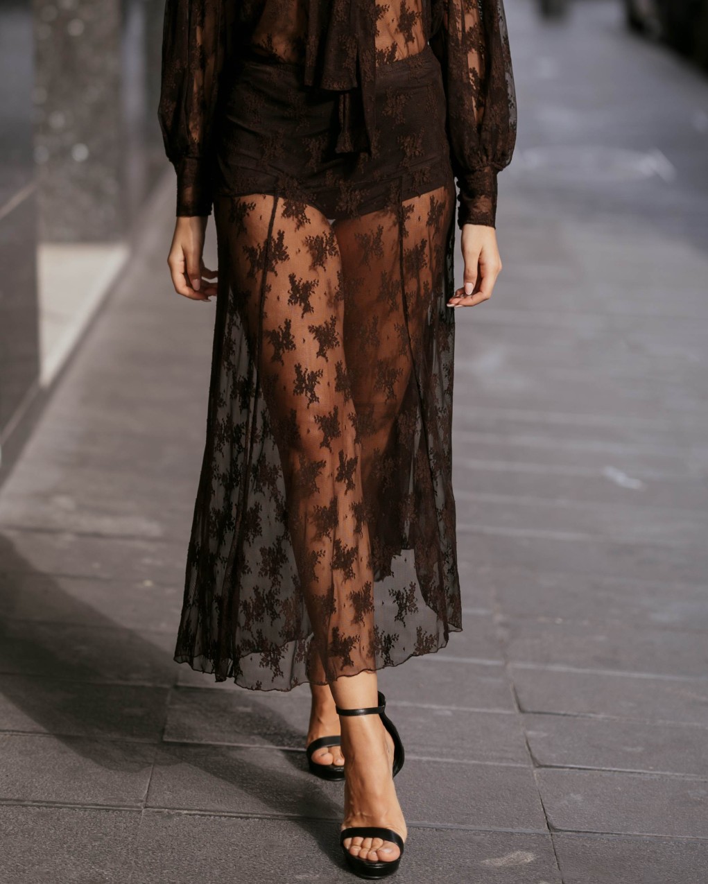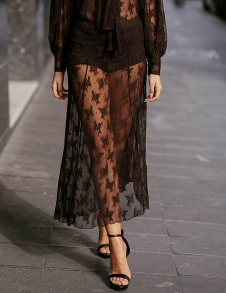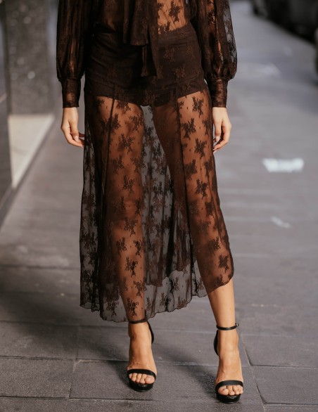 Elegante gonna midi in pregiato pizzo floreale con raffinata trasparenza e orlo asimmetrico. Il design sofisticato presenta una fodera mini integrata per un effetto vedo-non-vedo di grande impatto. La vestibilità aderente nella parte superiore si sviluppa in un delicato movimento fluido, ideale per occasioni speciali ed eventi serali.