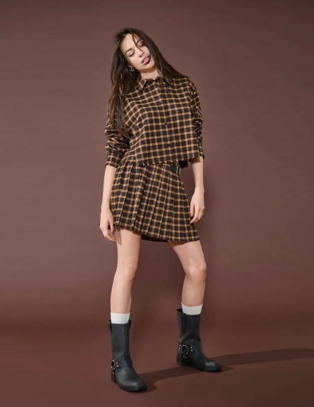 Minigonna plissettata dal taglio sartoriale con motivo a quadri e cintura regolabile con fibbia. La gonna presenta una silhouette svasata che garantisce libertà di movimento, realizzata in morbido tessuto che mantiene perfettamente la piega. Il design versatile si abbina perfettamente a canotte basic o top aderenti per un look casual-chic.