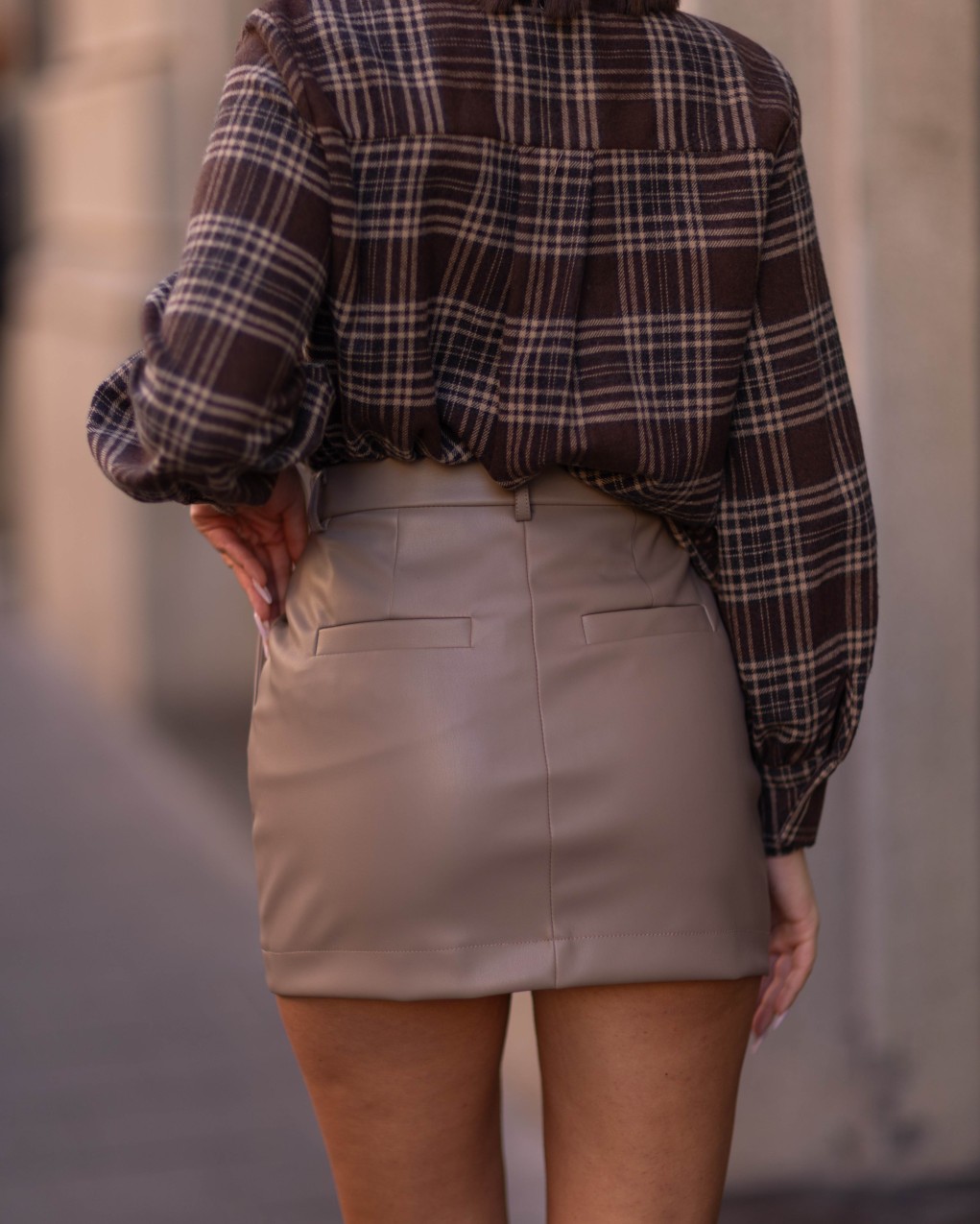 Elegante mini gonna realizzata in ecopelle di qualità, perfetta per un look contemporaneo e sofisticato. Caratterizzata da chiusura con bottone frontale, passanti per cintura e tasche funzionali che uniscono praticità e stile. La vestibilità è aderente a vita alta, con orlo risvoltato che conferisce un tocco sartoriale al capo. Ideale per outfit casual-chic e occasioni informali, si abbina facilmente a camicie, bluse o maglieria.