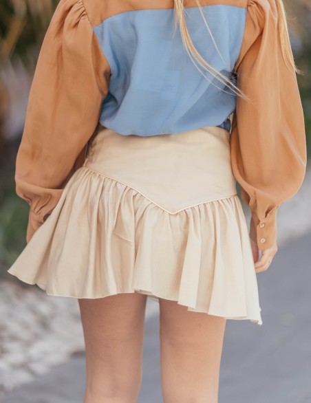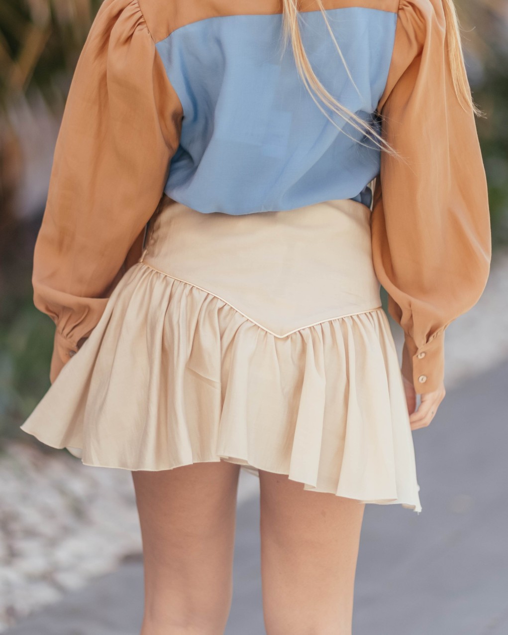 Minigonna a vita alta con design a balze plissettate per un look femminile e giovanile. Realizzata in tessuto fluido e leggero, presenta una fascia in vita strutturata con dettaglio a punta che slancia la figura. Il taglio svasato con arricciature conferisce movimento e volume, mentre la lunghezza mini valorizza le gambe. Vestibilità regolare con chiusura posteriore, ideale per occasioni casual-chic ed eventi informali.