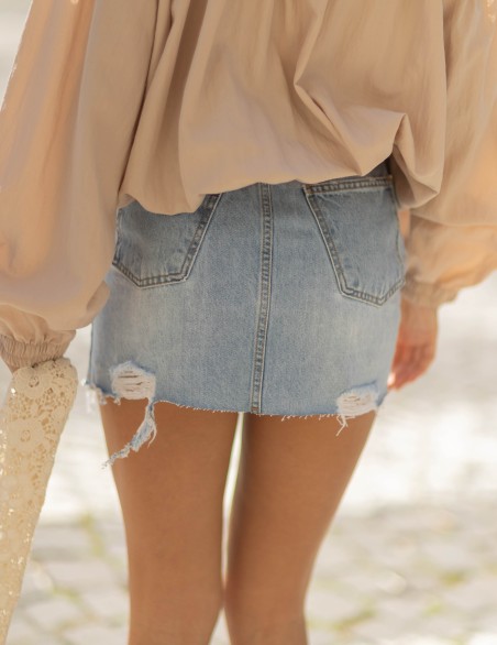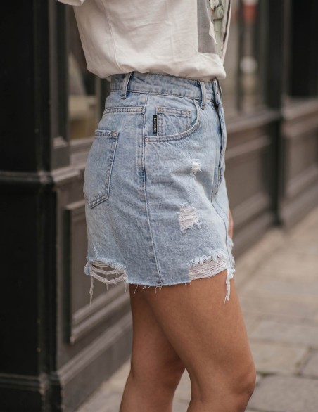 Minigonna in denim dallo stile casual-urban con dettagli destroyed e orlo sfrangiato per un look contemporaneo e vissuto. Realizzata in robusto tessuto di jeans, presenta tasche funzionali, chiusura frontale con bottone metallico e passanti per cintura. La vestibilità è aderente in vita con linea dritta, perfetta per creare outfit informali e di tendenza. Il finish distressed con strappi strategici aggiunge carattere e personalità al capo.