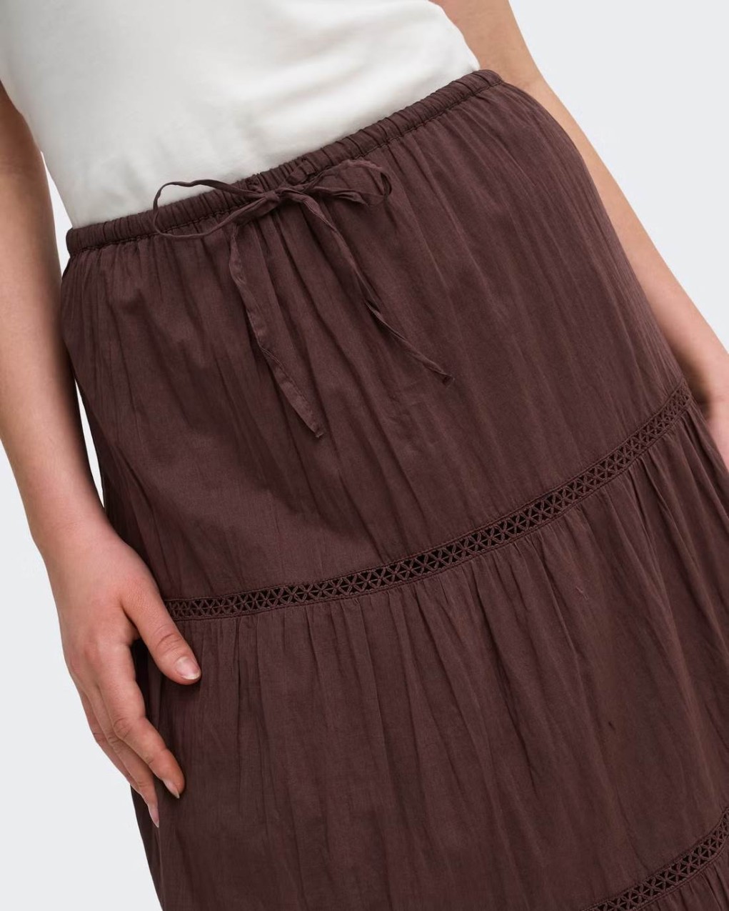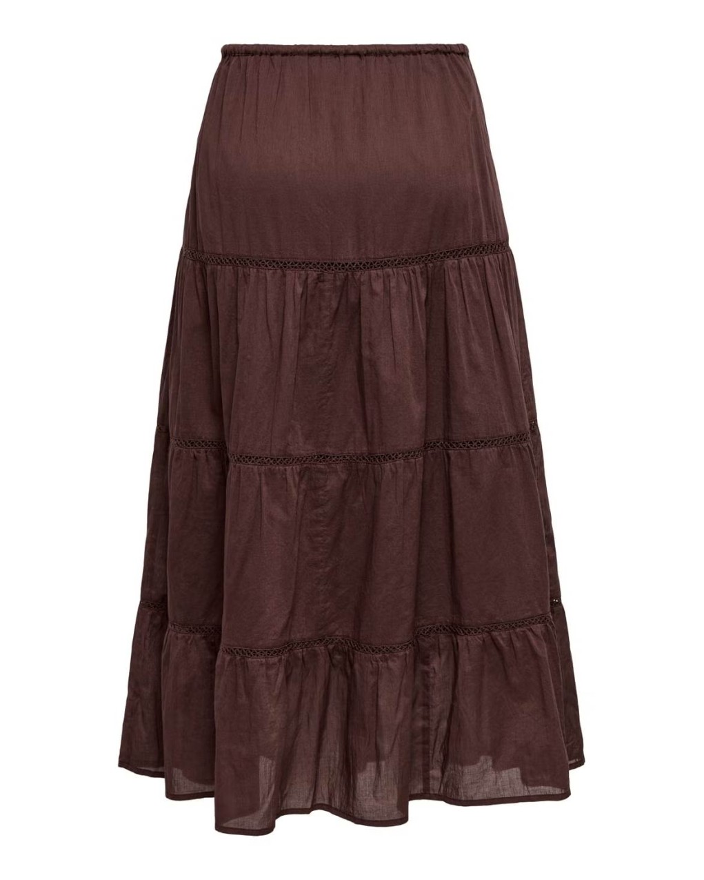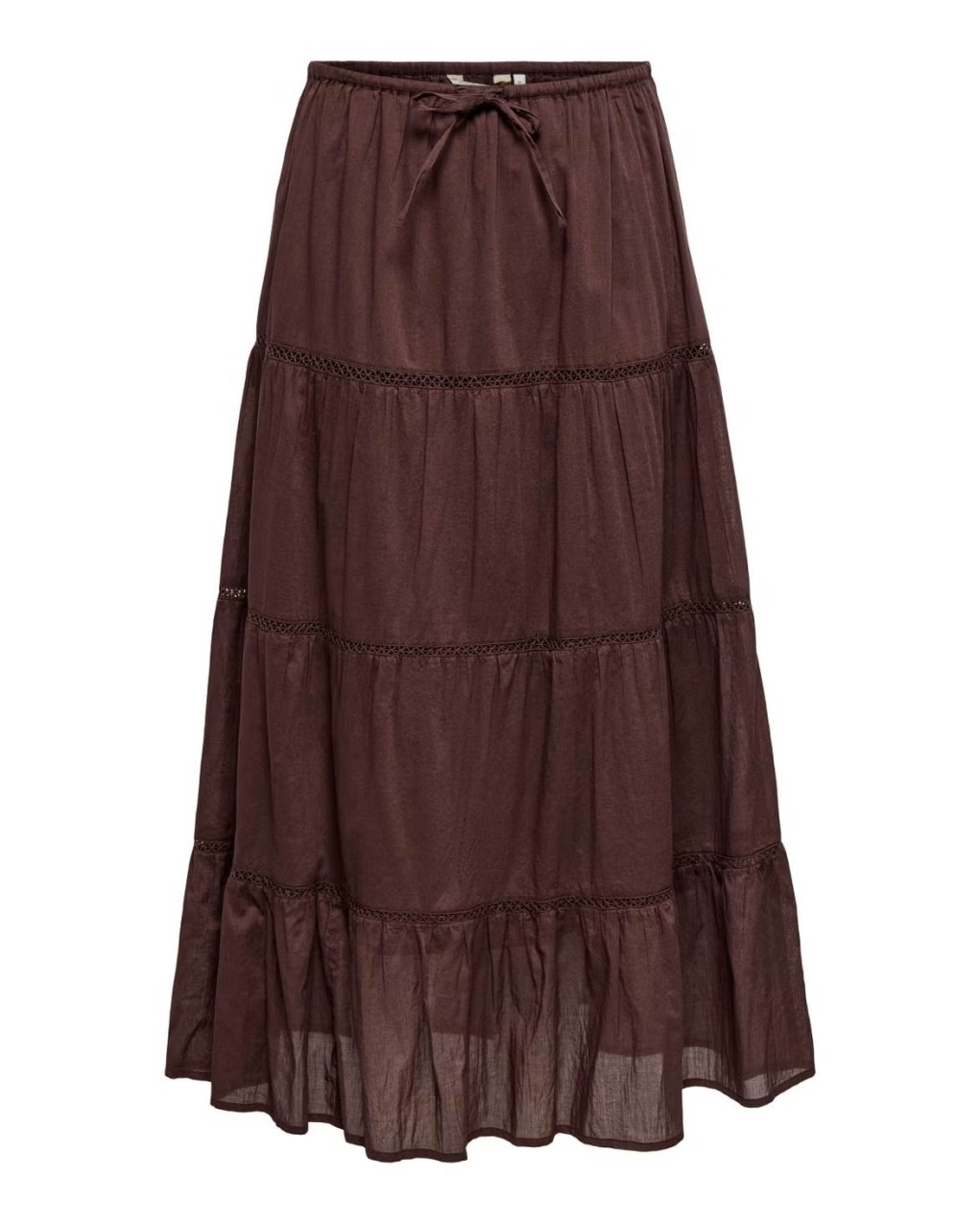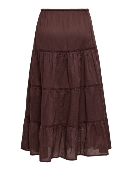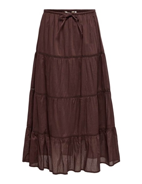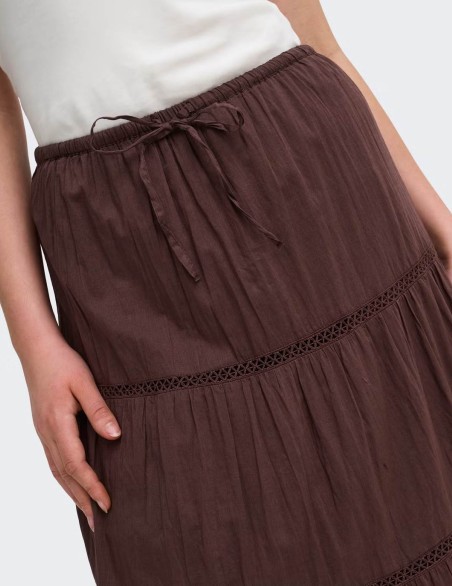 Gonna lunga a balze in stile boho-chic, perfetta per un look casual ed elegante. Caratterizzata da una struttura a più livelli con inserti in pizzo decorativo che separano ogni balza, conferendo movimento e femminilità al capo. Realizzata in tessuto leggero e fluido, presenta una pratica coulisse in vita per una vestibilità regolabile e confortevole. Il taglio midi e la silhouette ampia garantiscono libertà di movimento e un'allure romantica ideale per ogni occasione.