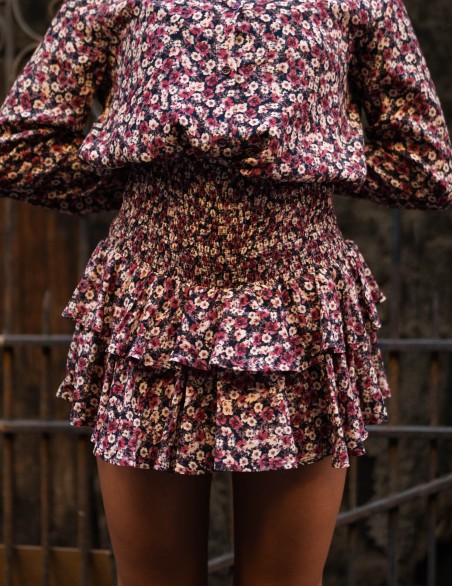 Mini gonna in tessuto leggero con delicata stampa floreale all-over. Design femminile caratterizzato da una vita elasticizzata che crea un effetto blouson. La gonna presenta eleganti balze sovrapposte che donano movimento e raffinatezza al capo, perfetto per look romantici e primaverili.