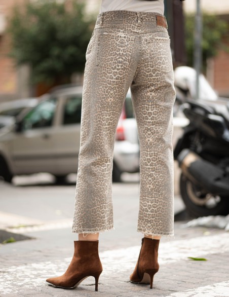 Pantaloni denim a zampa corta con stampa animalier leopardata, perfetti per un look contemporaneo e grintoso. Realizzati in tessuto denim di qualità, presentano classiche tasche e chiusura frontale con bottoni. La vestibilità è regolare con gamba leggermente svasata e lunghezza alla caviglia, ideale per esaltare la silhouette. Un capo versatile che unisce comfort e stile urban-chic per ogni occasione casual.
