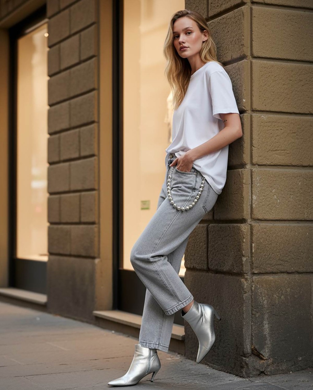●Jeans a vita alta con gamba dritta e fit morbido. Modello cinque tasche. Modello cropped. Chiusura frontale con zip e bottone. Denim grigio. Con accessorio catena in metallo agganciata sui passanti.
