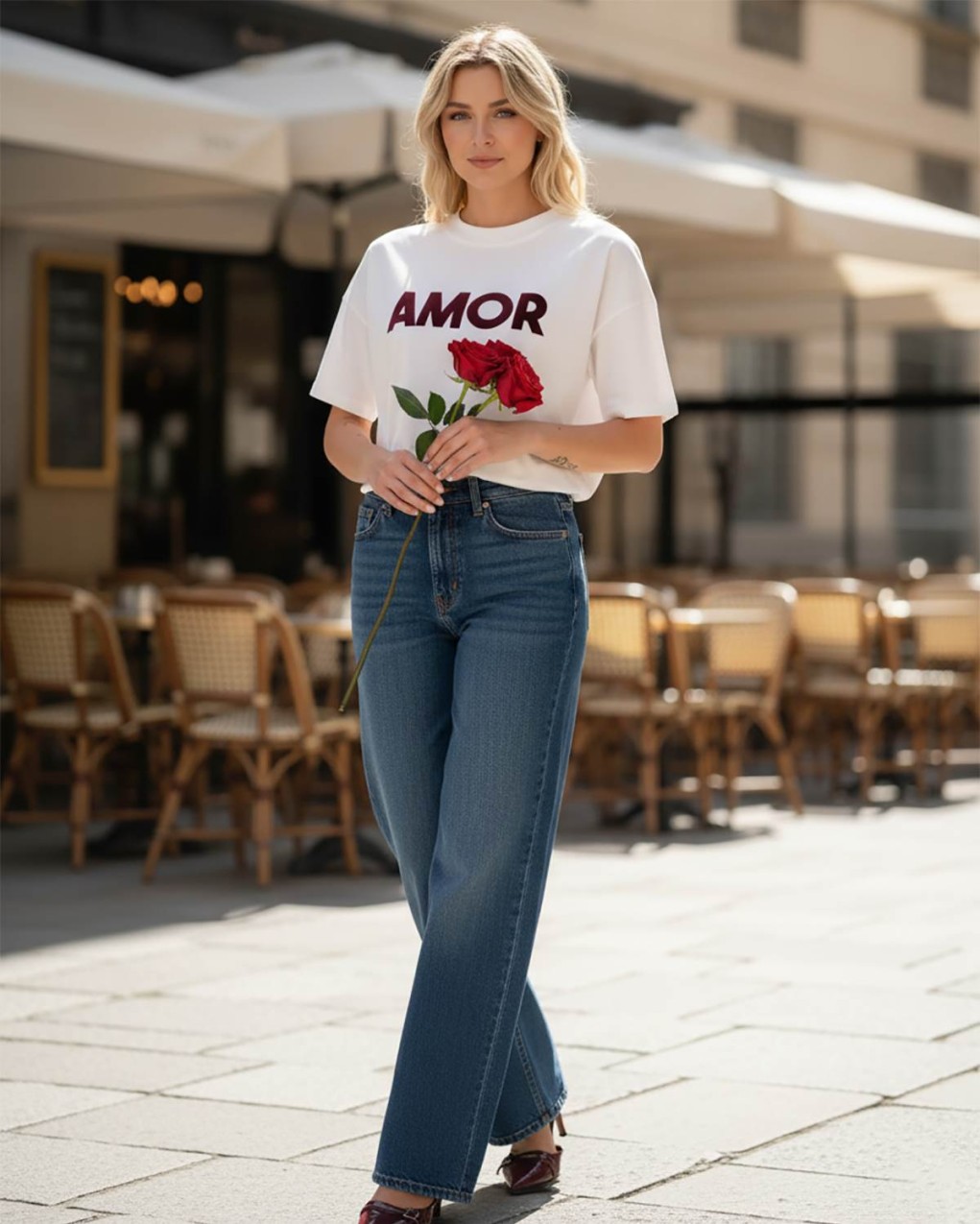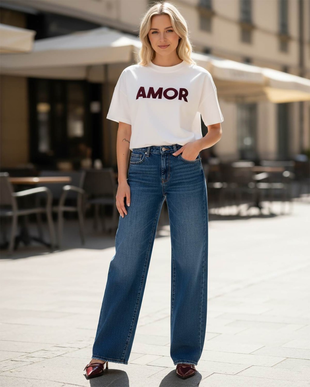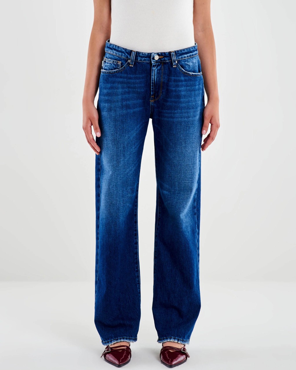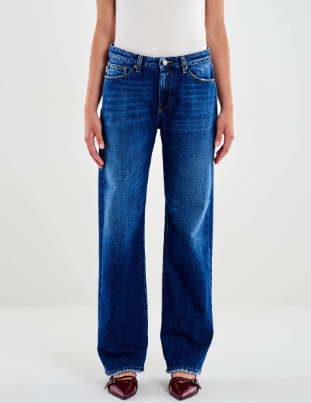 Jeans a vita regolare in denim blu. Modello cinque tasche. Gamba larga extra lunga. Chiusura frontale con zip e bottone.