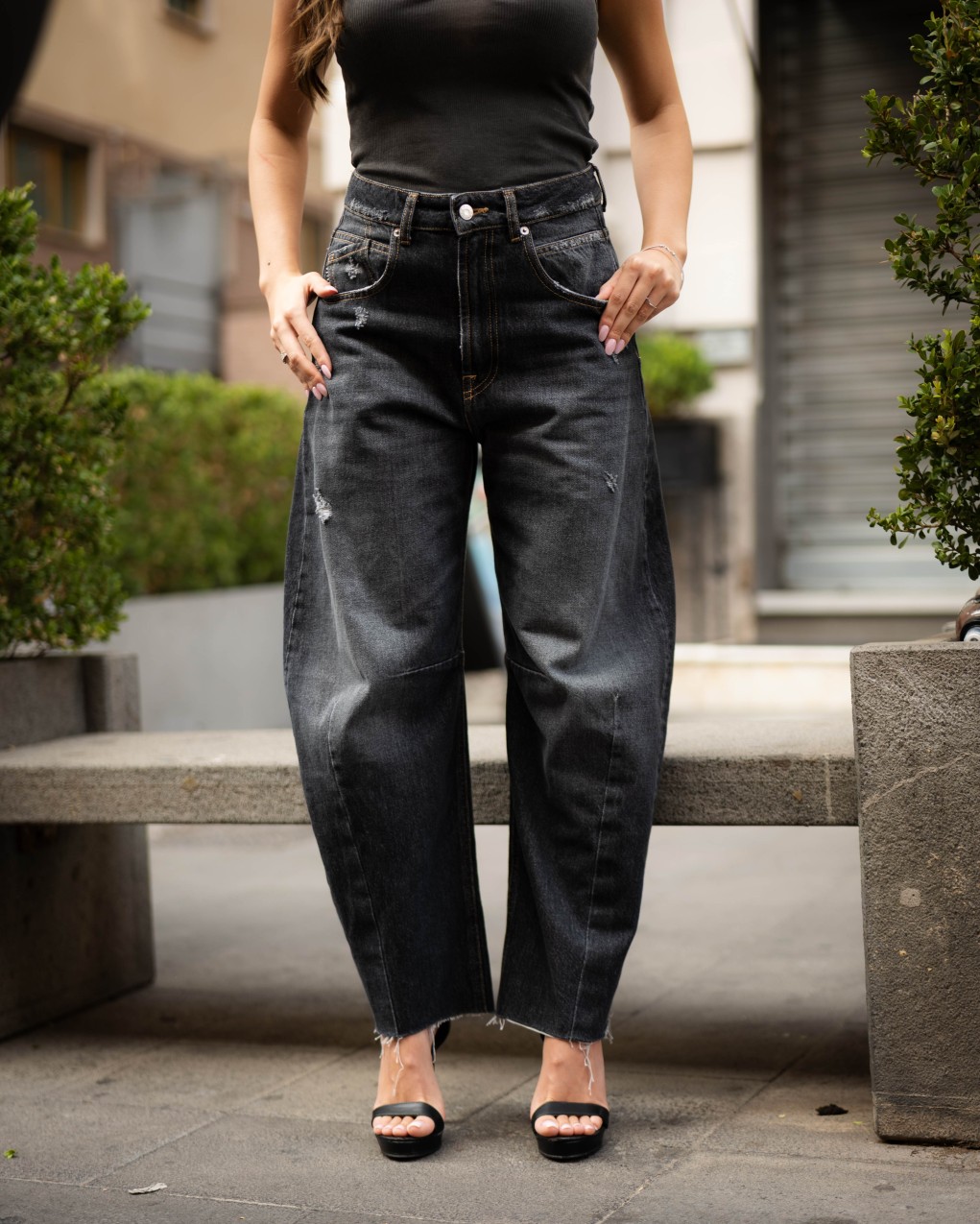 Jeans dal taglio oversize con gamba ampia e vita alta, realizzati in resistente denim di alta qualità. Il design contemporaneo presenta dettagli vissuti e orli sfrangiati per un look casual-chic. La vestibilità comoda e rilassata si abbina a tasche funzionali e cuciture rinforzate, perfetti per uno stile urban di tendenza.
