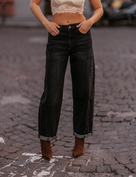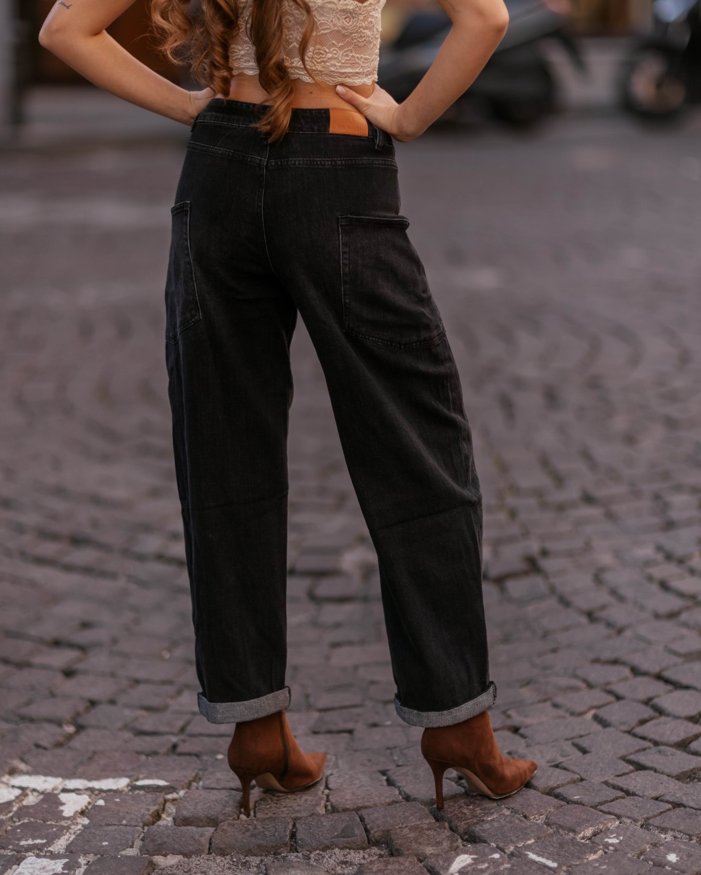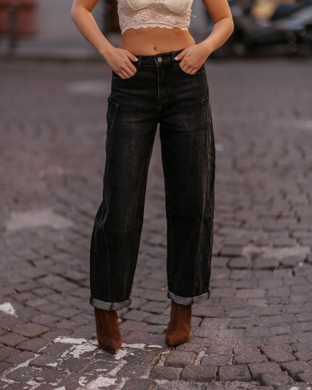 Jeans cargo da donna dallo stile urban-contemporary con vestibilità ampia e rilassata. Realizzati in denim resistente con effetto vissuto, presentano tasche funzionali applicate sulle gambe e chiusura con bottone a vita alta. Il taglio wide leg e la lunghezza alla caviglia permettono di creare un look moderno e versatile, perfetto per abbinamenti casual-chic.
