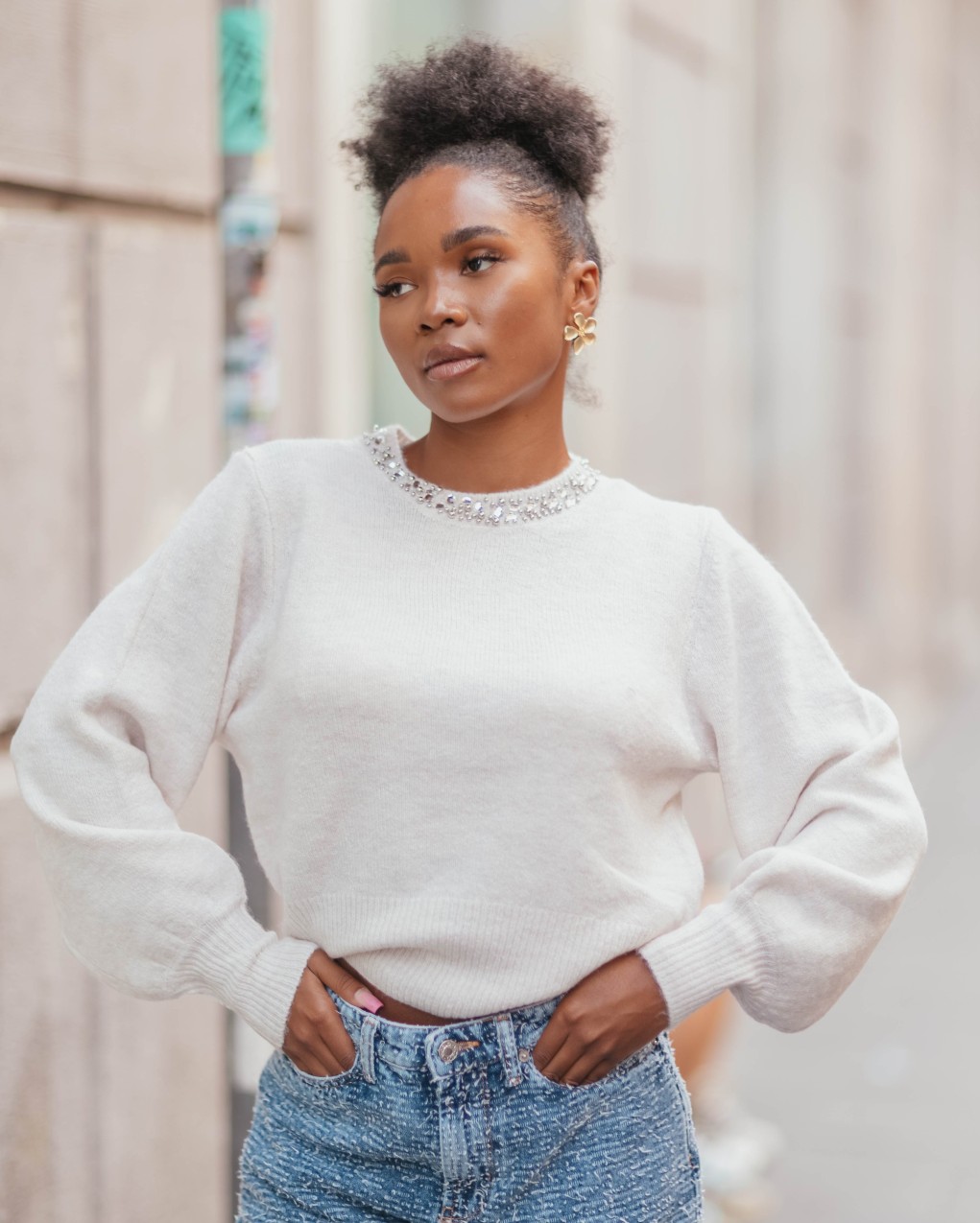 •La particolarità di questo capo è la finta collana di strass che adorna il collo: gli strass sono applicati direttamente sulla maglia, creando l'illusione di un gioiello incorporato