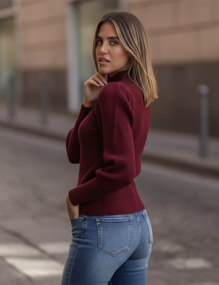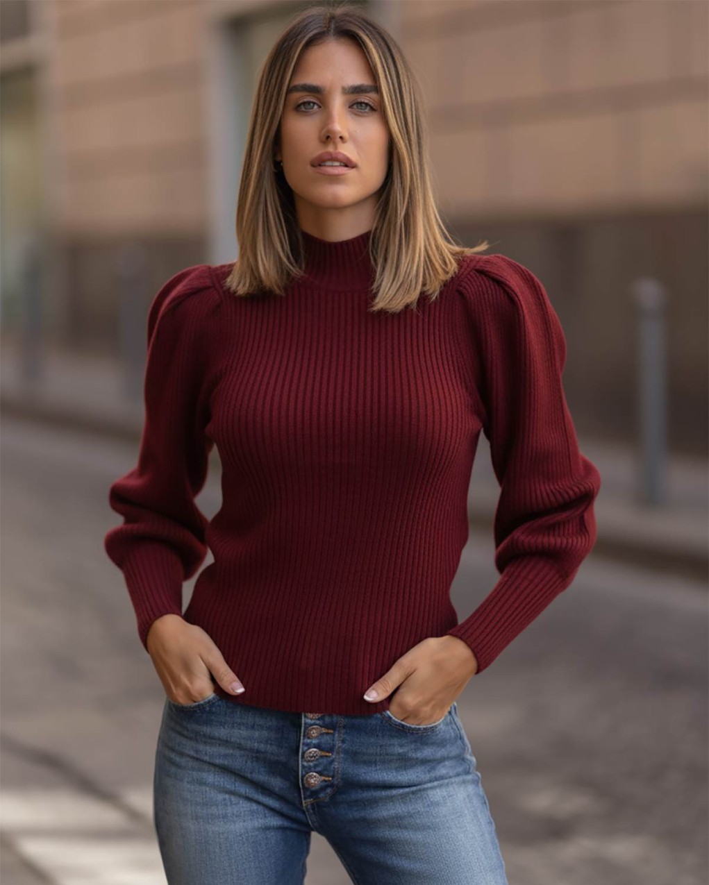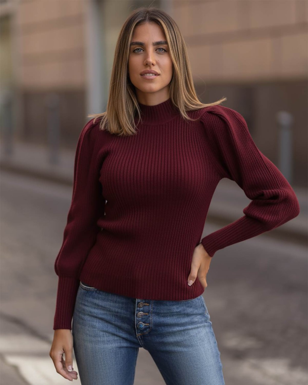 Maglia a costine con collo a lupetto, caratterizzato da maniche a palloncino dal volume ricercato e polsini aderenti. Realizzato in morbida lana, presenta una vestibilità aderente che esalta la silhouette. La lavorazione a coste verticali e il design sofisticato lo rendono perfetto per outfit sia casual che formali.