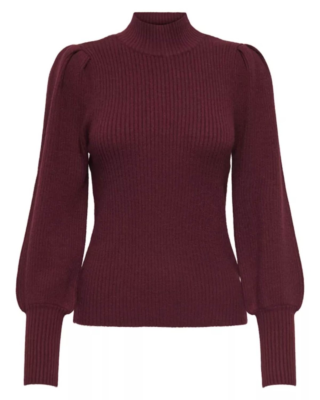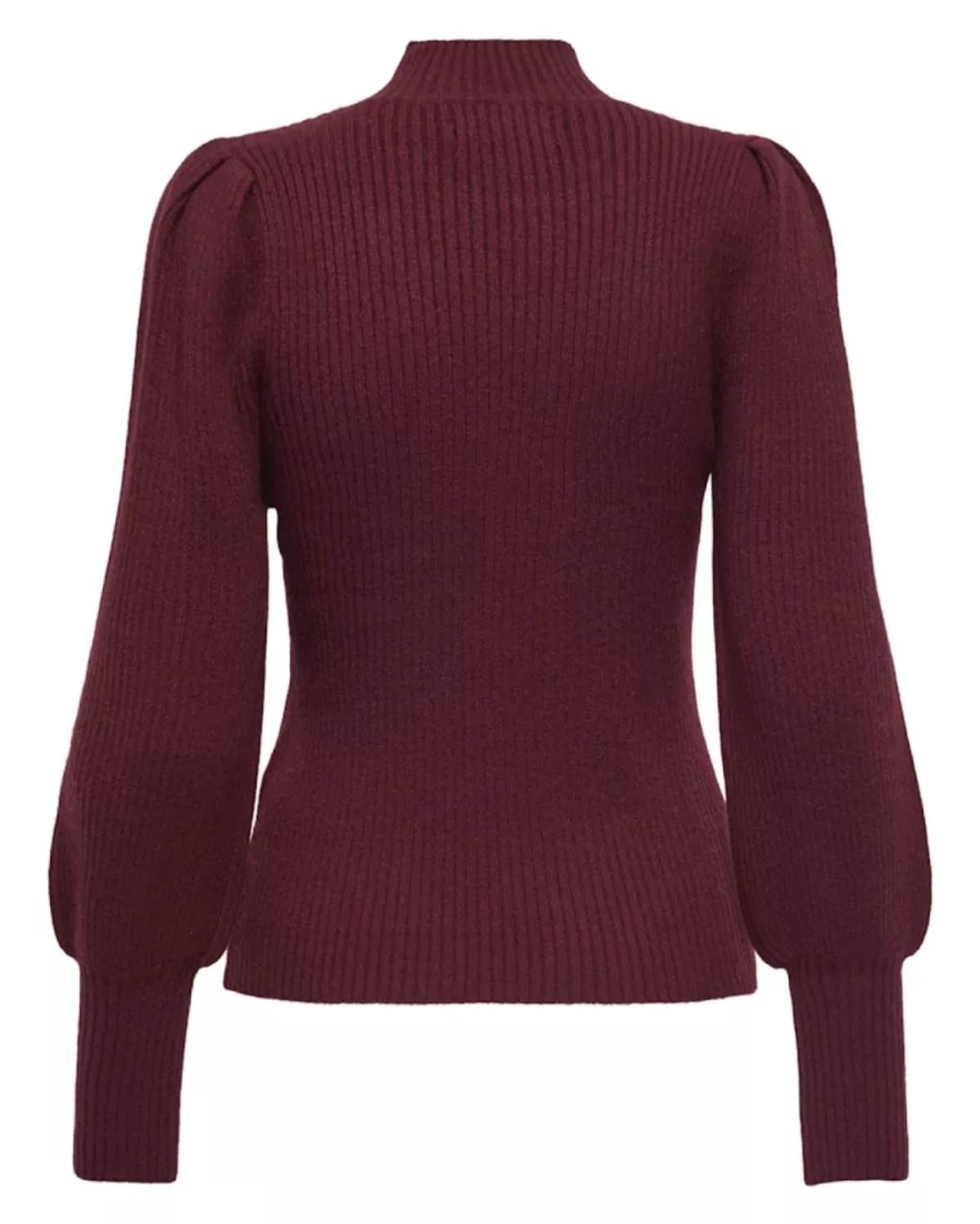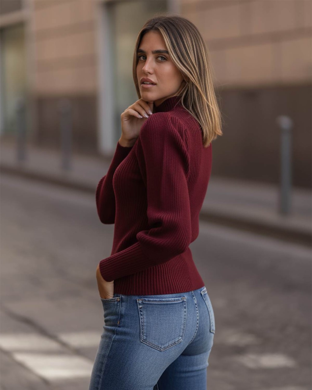 Maglia a costine con collo a lupetto, caratterizzato da maniche a palloncino dal volume ricercato e polsini aderenti. Realizzato in morbida lana, presenta una vestibilità aderente che esalta la silhouette. La lavorazione a coste verticali e il design sofisticato lo rendono perfetto per outfit sia casual che formali.