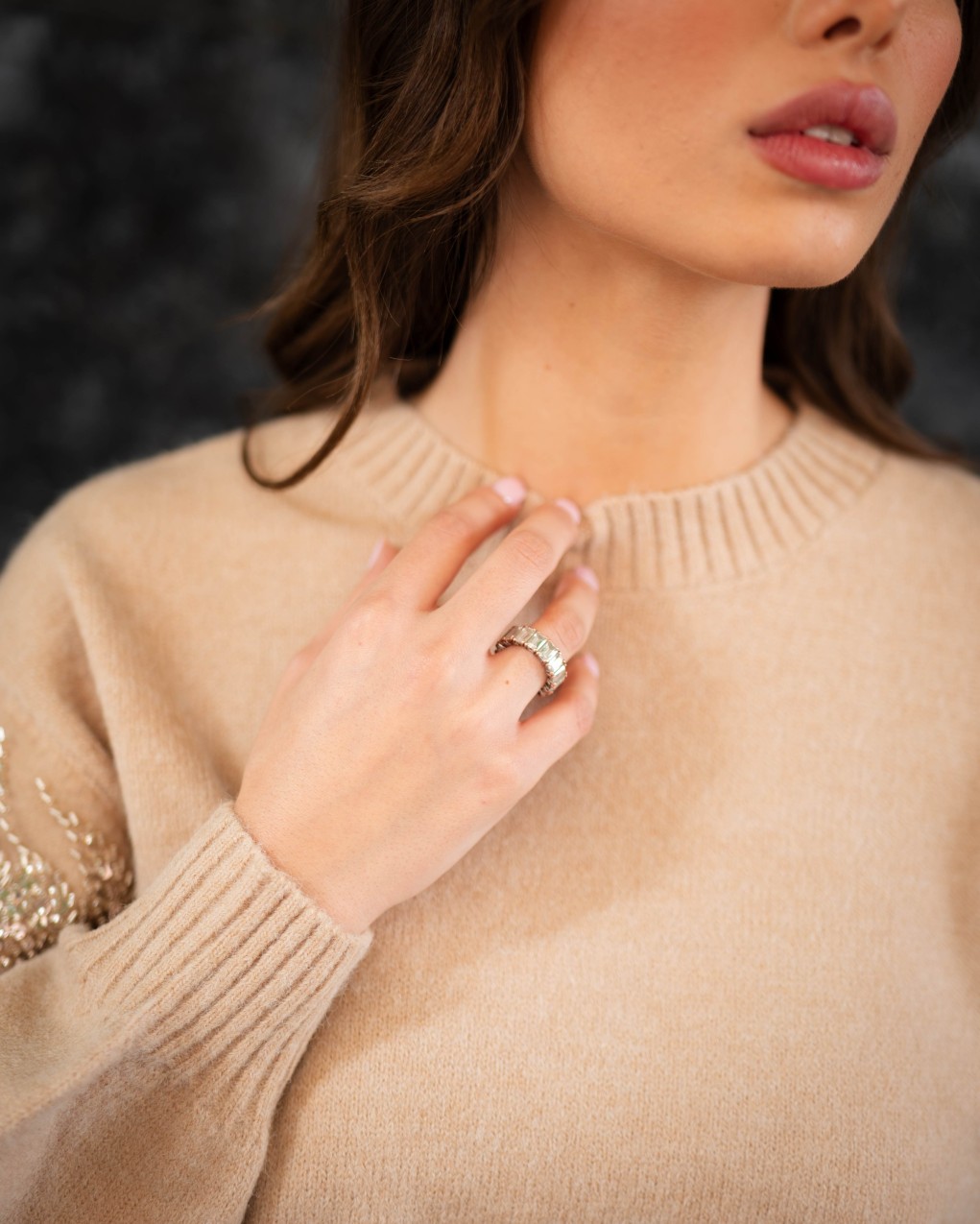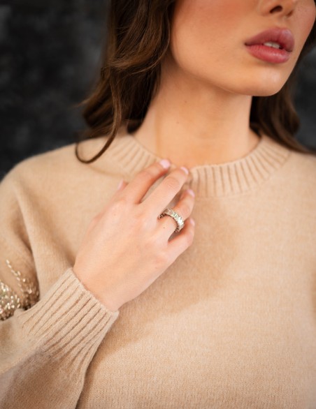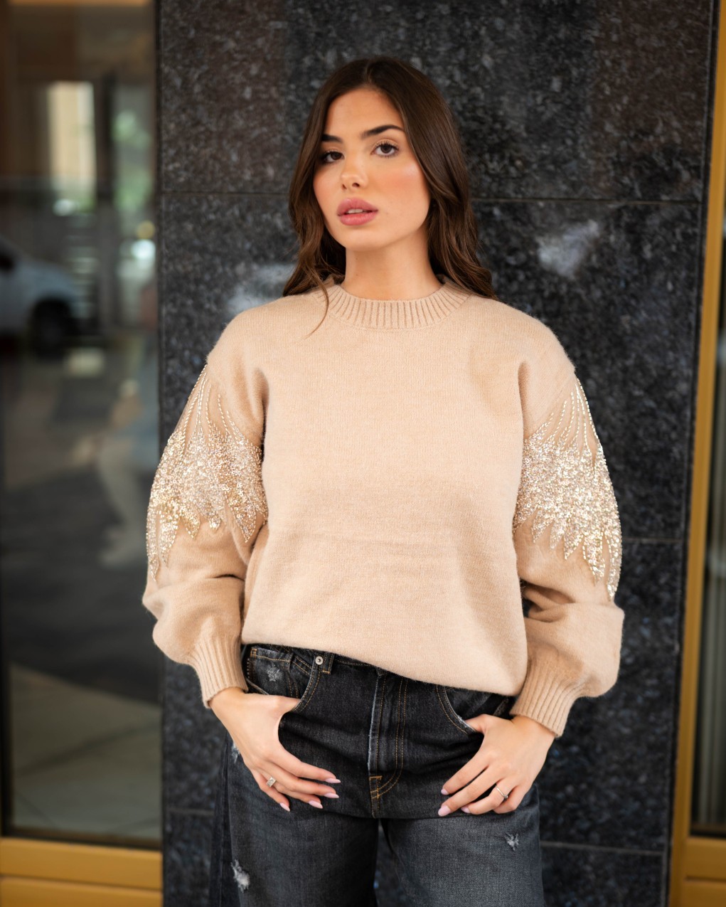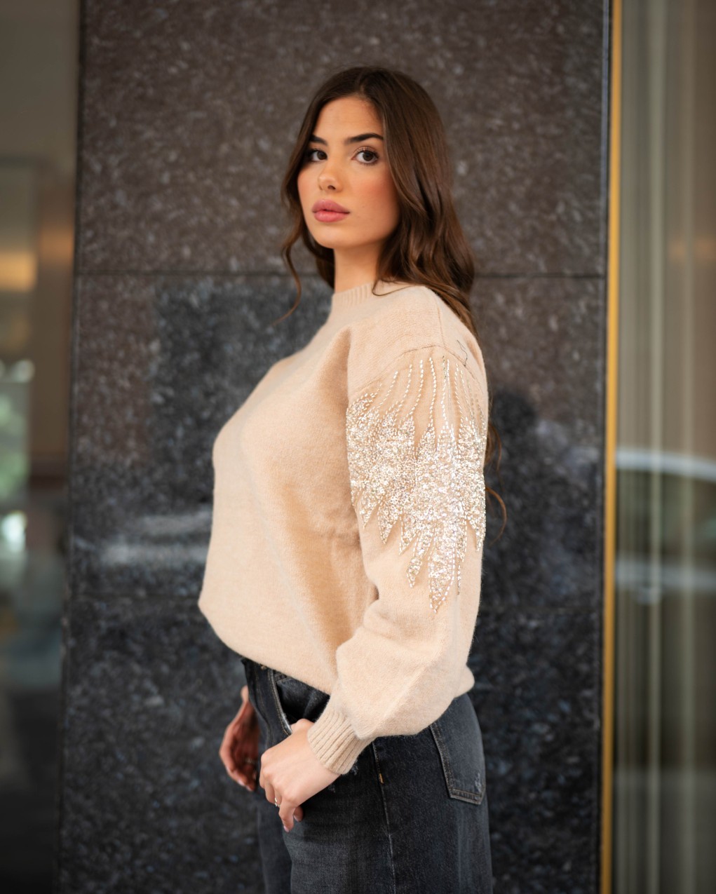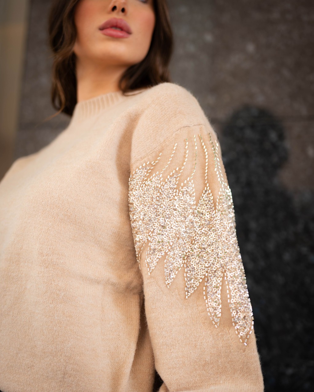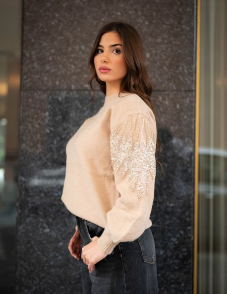 Maglione oversize in morbida lana con dettagli decorativi in paillettes sulle maniche. Il design presenta un collo a costine, maniche ampie a palloncino e una vestibilità comoda e avvolgente. La combinazione di comfort casual e dettagli luminosi rende questo capo perfetto per elevare i look quotidiani con un tocco di eleganza.