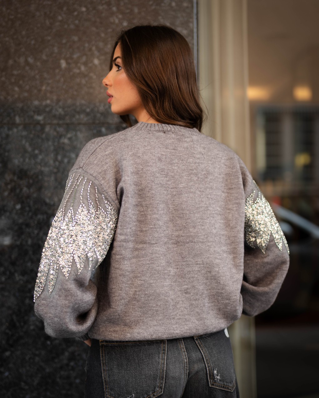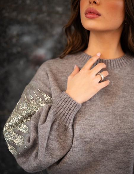 Maglione oversize in morbida lana con dettagli decorativi in paillettes sulle maniche. Il design presenta un collo a costine, maniche ampie a palloncino e una vestibilità comoda e avvolgente. La combinazione di comfort casual e dettagli luminosi rende questo capo perfetto per elevare i look quotidiani con un tocco di eleganza.