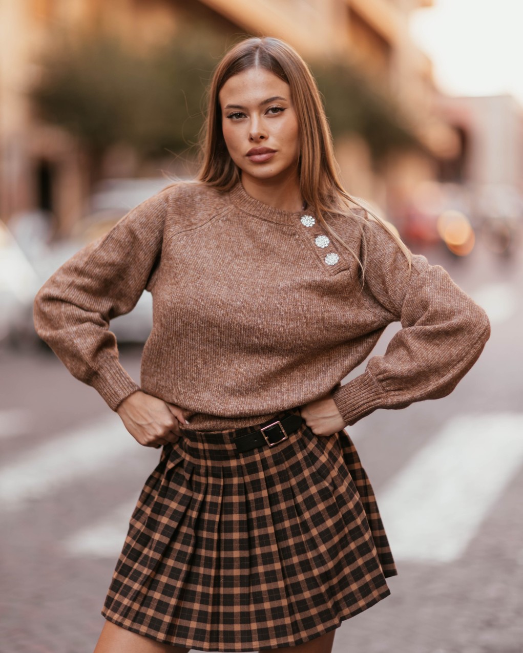 Maglione in morbida lana lavorata a maglia con elegante design asimmetrico, impreziosito da bottoni decorativi gioiello sulla spalla. La vestibilità comoda e leggermente oversize si abbina perfettamente a ogni look, mentre i polsini e il bordo a coste garantiscono una silhouette definita. Un capo versatile che unisce comfort e raffinatezza, ideale per la stagione autunnale.