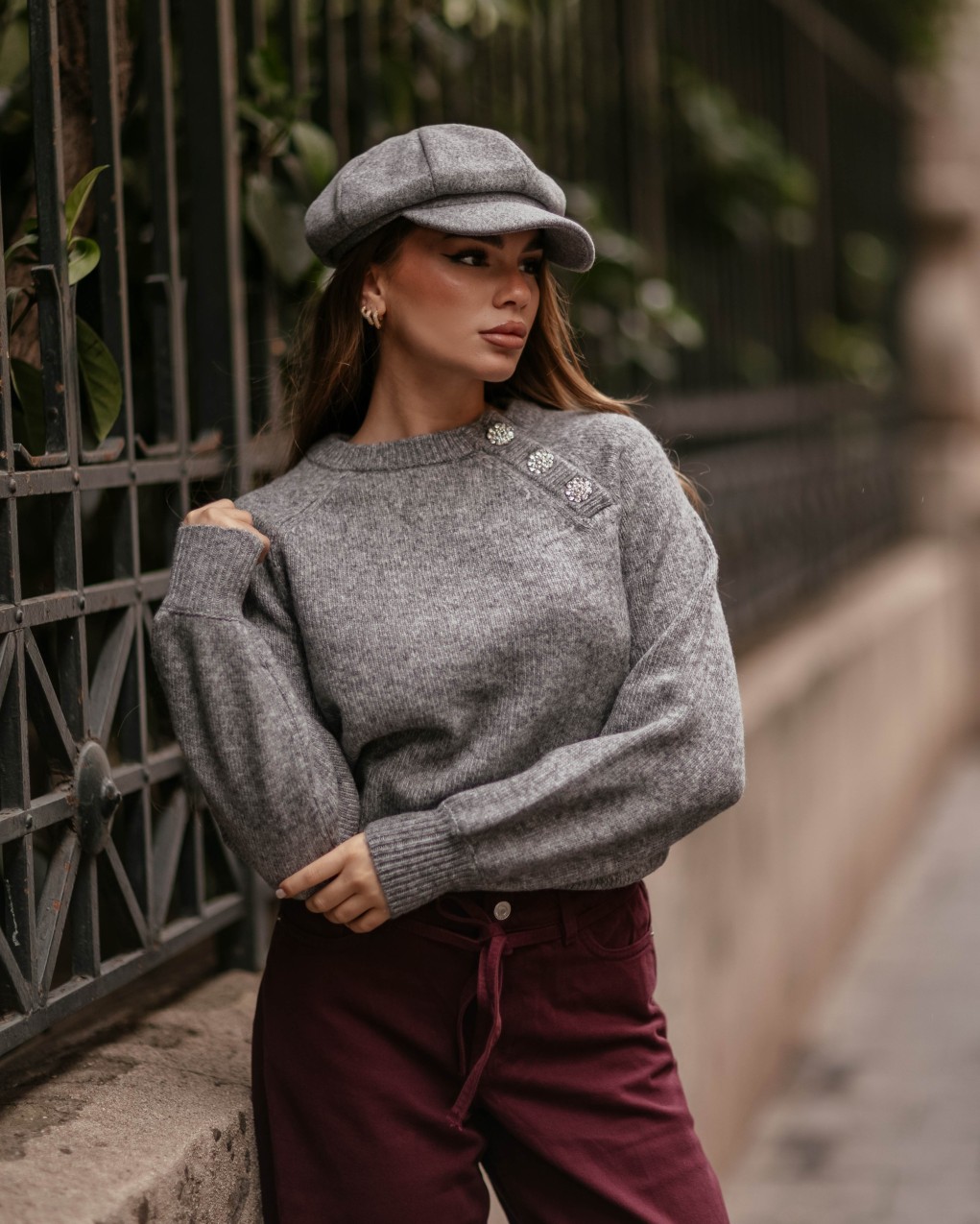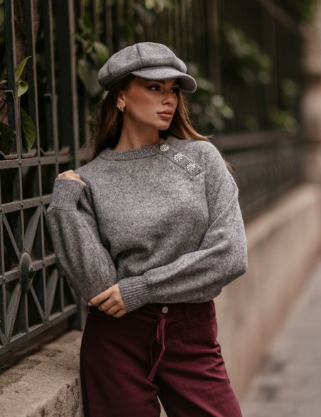 Maglione in morbida lana lavorata a maglia con elegante design asimmetrico, impreziosito da bottoni decorativi gioiello sulla spalla. La vestibilità comoda e leggermente oversize si abbina perfettamente a ogni look, mentre i polsini e il bordo a coste garantiscono una silhouette definita. Un capo versatile che unisce comfort e raffinatezza, ideale per la stagione autunnale.