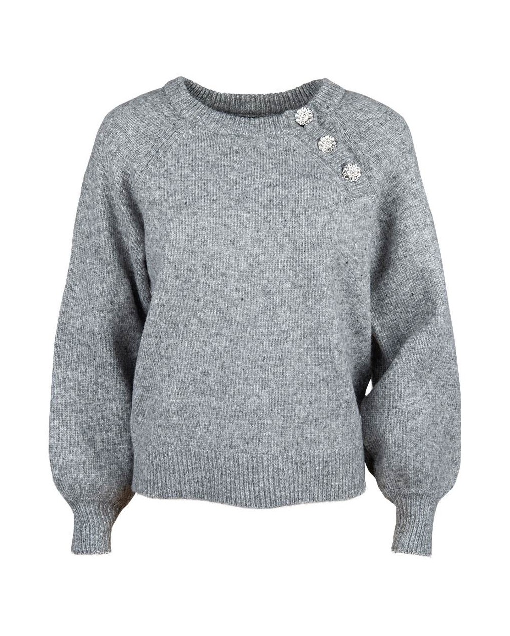 Maglione in morbida lana lavorata a maglia con elegante design asimmetrico, impreziosito da bottoni decorativi gioiello sulla spalla. La vestibilità comoda e leggermente oversize si abbina perfettamente a ogni look, mentre i polsini e il bordo a coste garantiscono una silhouette definita. Un capo versatile che unisce comfort e raffinatezza, ideale per la stagione autunnale.