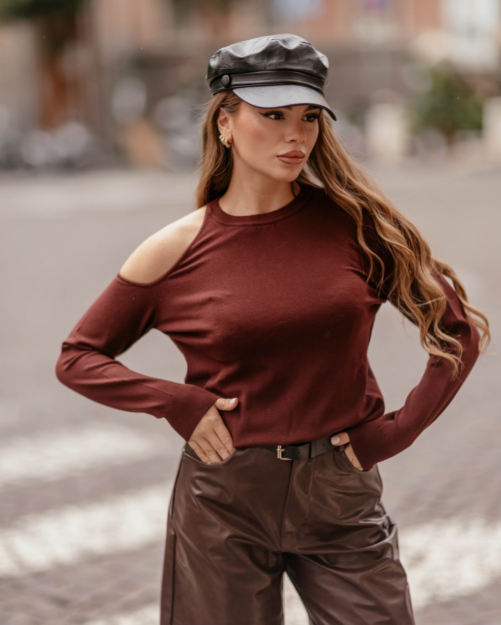 Elegante maglia a maniche lunghe con design cut-out asimmetrico sulla spalla, realizzata in morbido tessuto elasticizzato per un comfort ottimale. La vestibilità aderente e il taglio moderno donano un look contemporaneo e sofisticato, perfetto per outfit casual-chic. I polsini a costine e la linea pulita garantiscono una silhouette raffinata e versatile.