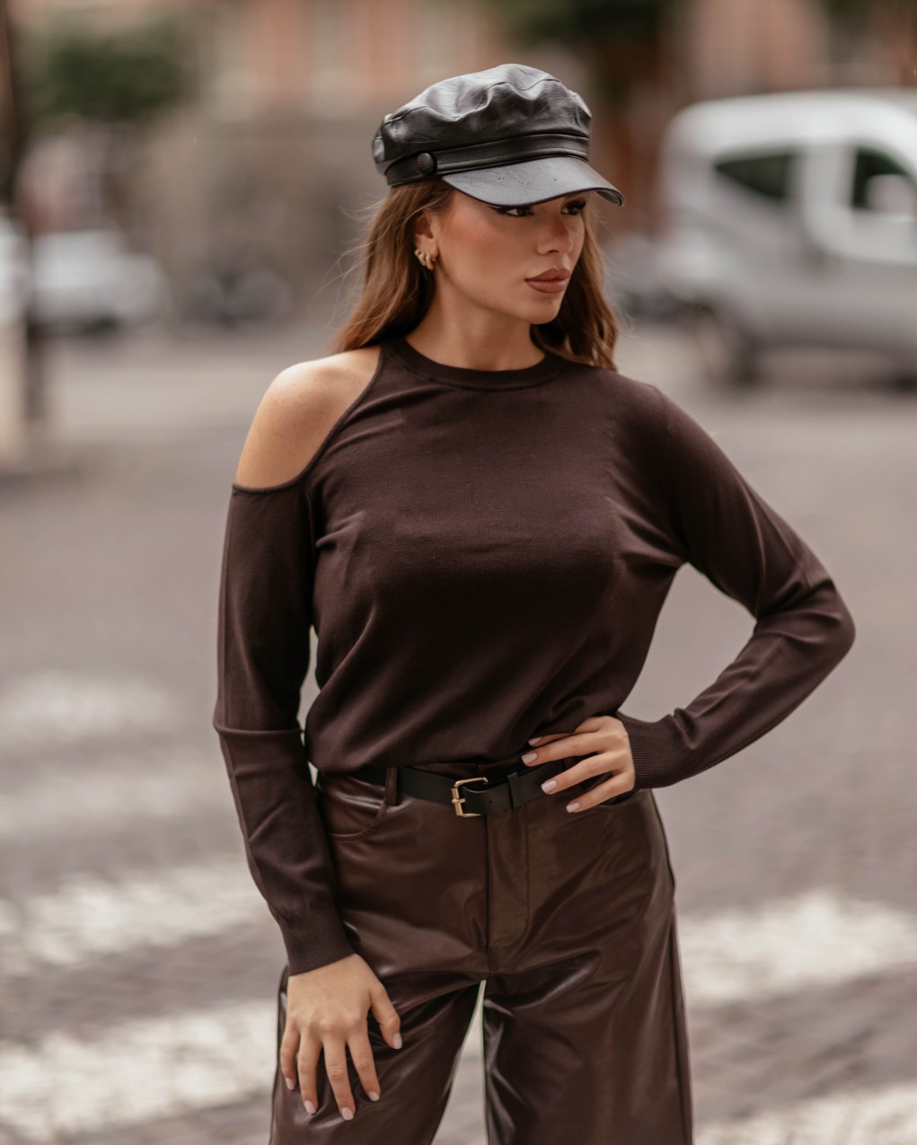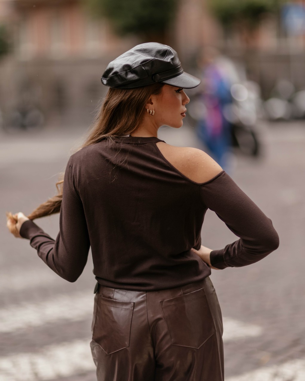 Elegante maglia a maniche lunghe con design cut-out asimmetrico sulla spalla, realizzata in morbido tessuto elasticizzato per un comfort ottimale. La vestibilità aderente e il taglio moderno donano un look contemporaneo e sofisticato, perfetto per outfit casual-chic. I polsini a costine e la linea pulita garantiscono una silhouette raffinata e versatile.
