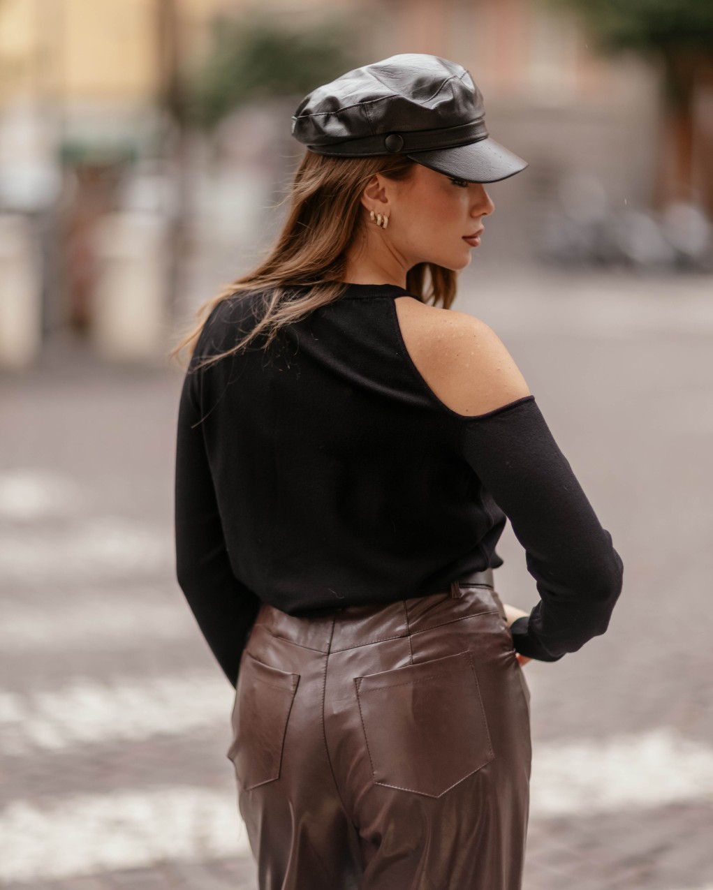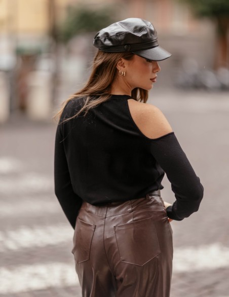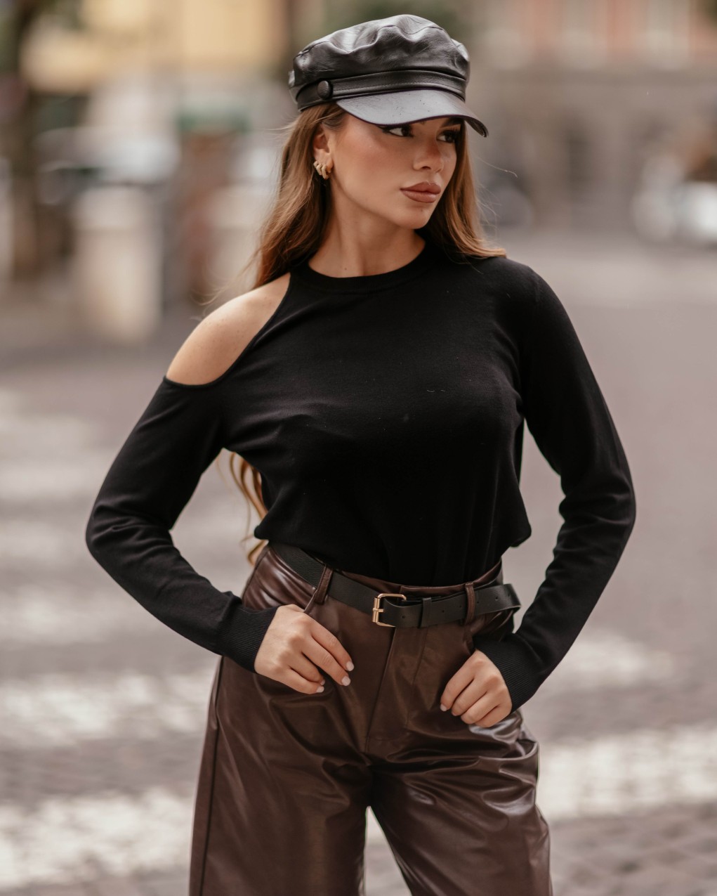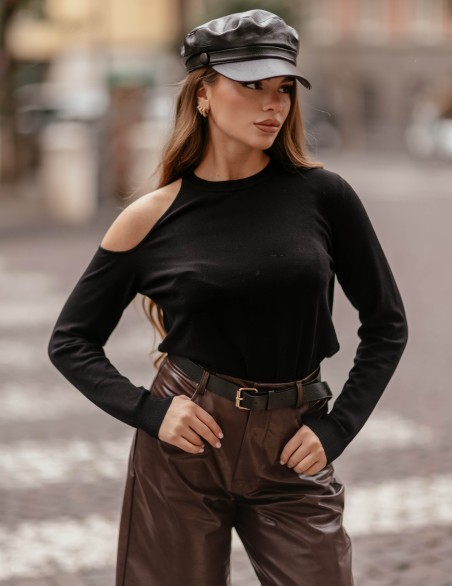 Elegante maglia a maniche lunghe con design cut-out asimmetrico sulla spalla, realizzata in morbido tessuto elasticizzato per un comfort ottimale. La vestibilità aderente e il taglio moderno donano un look contemporaneo e sofisticato, perfetto per outfit casual-chic. I polsini a costine e la linea pulita garantiscono una silhouette raffinata e versatile.