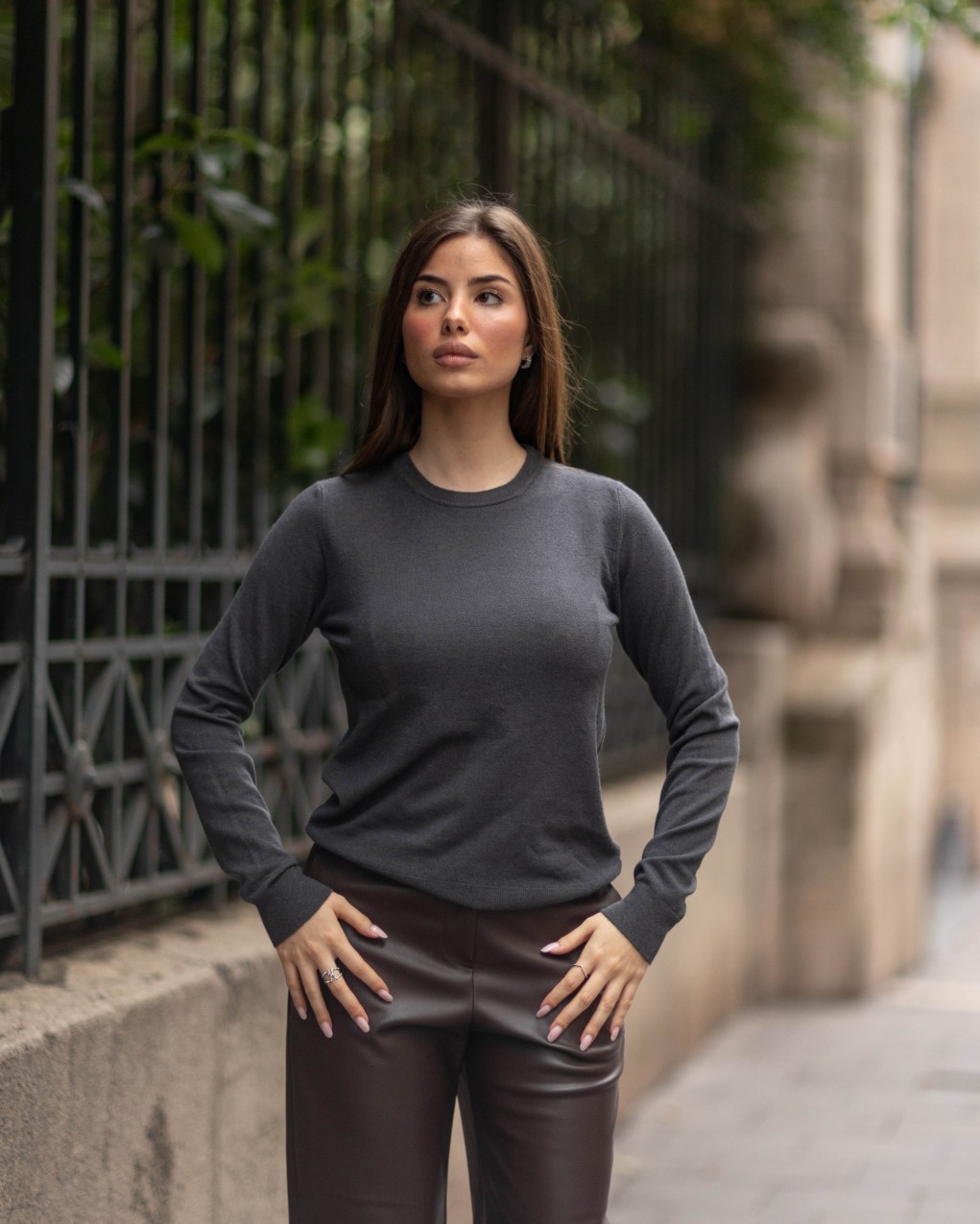 Maglia a girocollo realizzato in morbido tessuto con una vestibilità regular che segue armoniosamente le linee del corpo. Il design minimalista e la manifattura di alta qualità lo rendono un capo versatile perfetto per ogni occasione. Le rifiniture a costine sul collo, polsini e orlo garantiscono una silhouette pulita e duratura nel tempo.