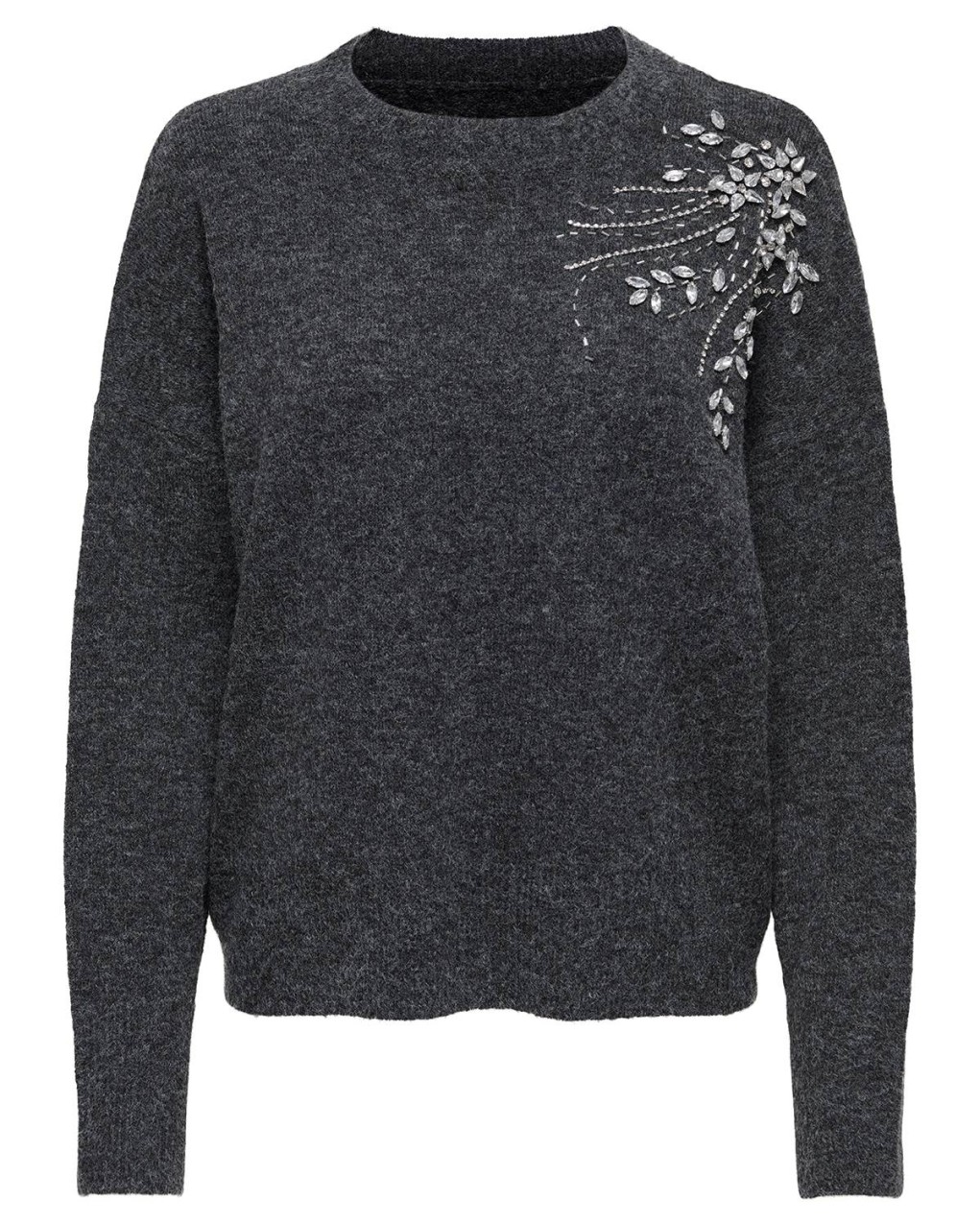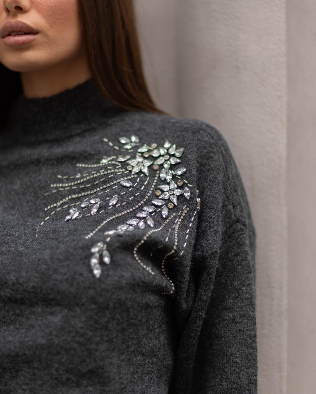 Elegante maglione dolcevita in morbida lana con raffinata applicazione di cristalli e perline sul petto in motivo floreale. Il design presenta una vestibilità comoda e leggermente oversize, ideale per look sofisticati invernali. La lavorazione artigianale dei dettagli decorativi aggiunge un tocco di lusso e femminilità a questo capo versatile.