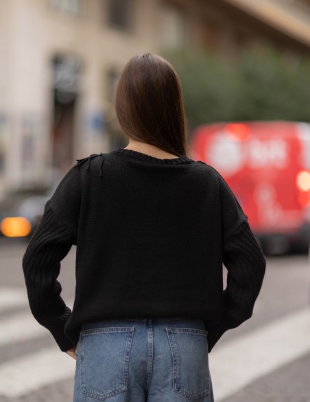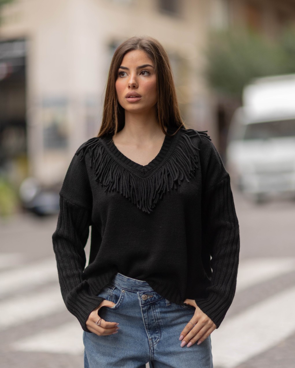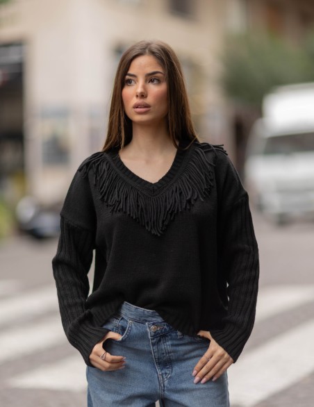 Maglione oversize con scollo a V decorato da eleganti frange sul pannello superiore. Realizzato in morbida maglia a coste con maniche ampie e polsini elasticizzati per un comfort ottimale. La vestibilità rilassata e il design contemporaneo lo rendono perfetto per look casual-chic da giorno.