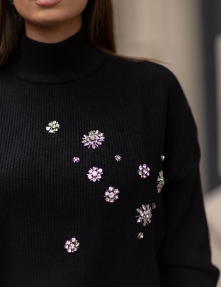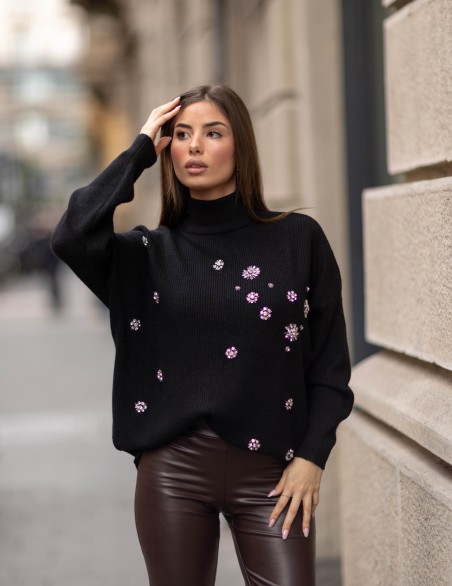 Maglione a collo alto in morbida lana lavorata a coste con delicati ricami floreali sparsi sul davanti. Il design oversized con maniche ampie offre massimo comfort e versatilità, mentre la finitura a costine su polsini e orlo garantisce una vestibilità strutturata. Perfetto per uno stile sofisticato e contemporaneo, questo pullover si distingue per i dettagli raffinati e la silhouette rilassata.