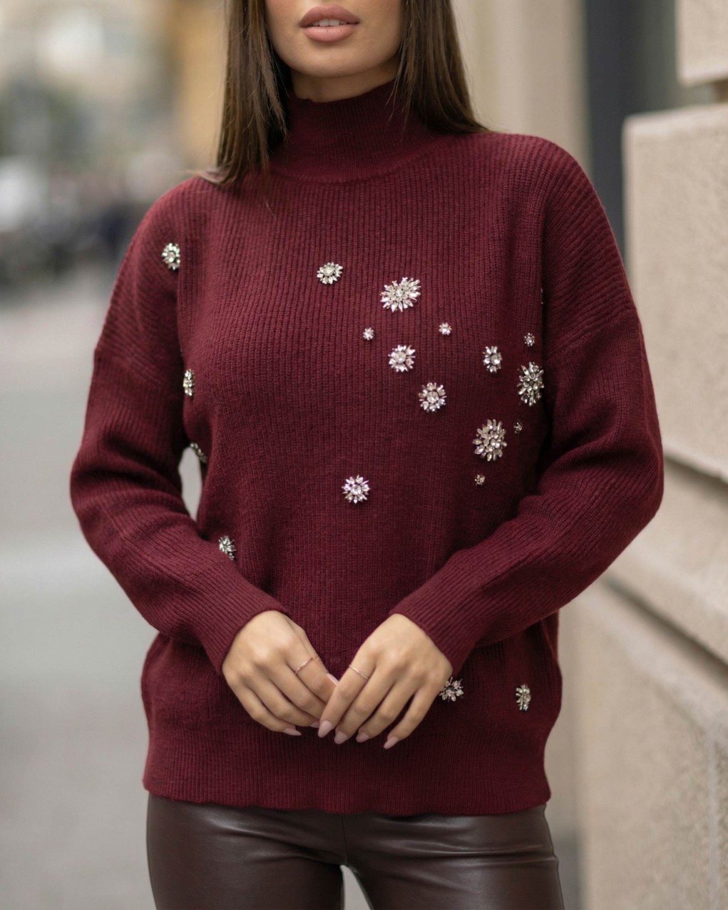 Maglione a collo alto in morbida lana lavorata a coste con delicati ricami floreali sparsi sul davanti. Il design oversized con maniche ampie offre massimo comfort e versatilità, mentre la finitura a costine su polsini e orlo garantisce una vestibilità strutturata. Perfetto per uno stile sofisticato e contemporaneo, questo pullover si distingue per i dettagli raffinati e la silhouette rilassata.