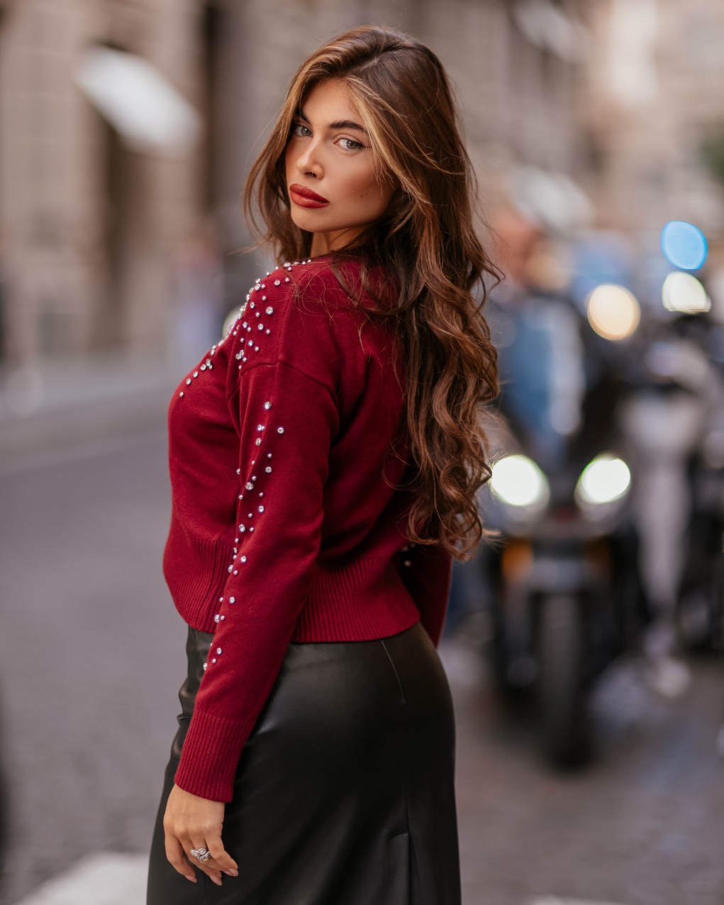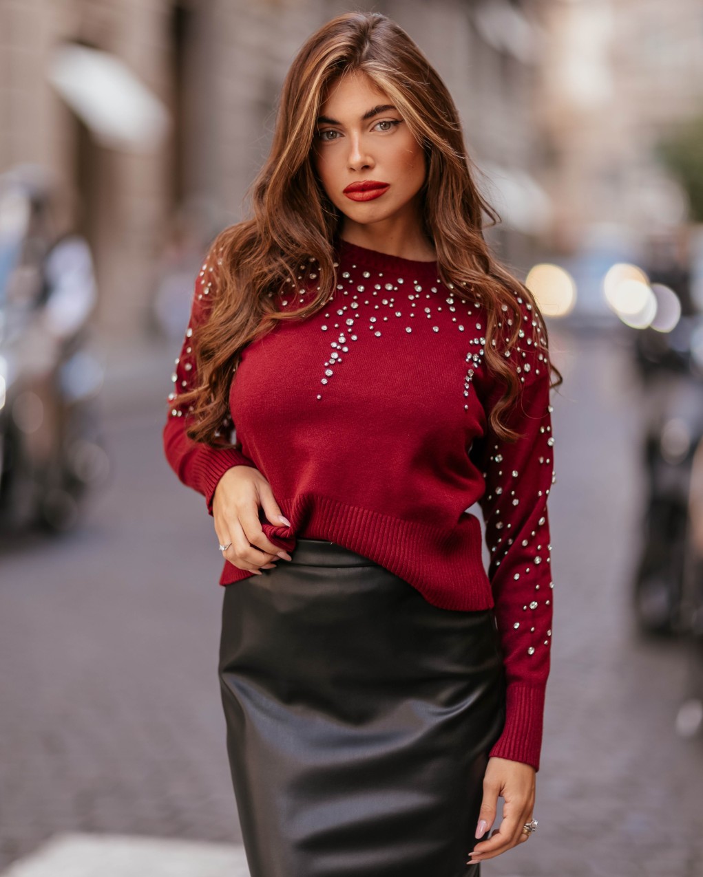 Elegante maglione in morbida lana con raffinata decorazione di perle applicate sulla parte superiore e sulle maniche. Il design presenta un taglio classico con girocollo e polsini a costine per una vestibilità comoda e femminile. La lavorazione a maglia di alta qualità garantisce calore e comfort, mentre i dettagli preziosi rendono questo capo perfetto per occasioni speciali o per elevare un outfit casual.
