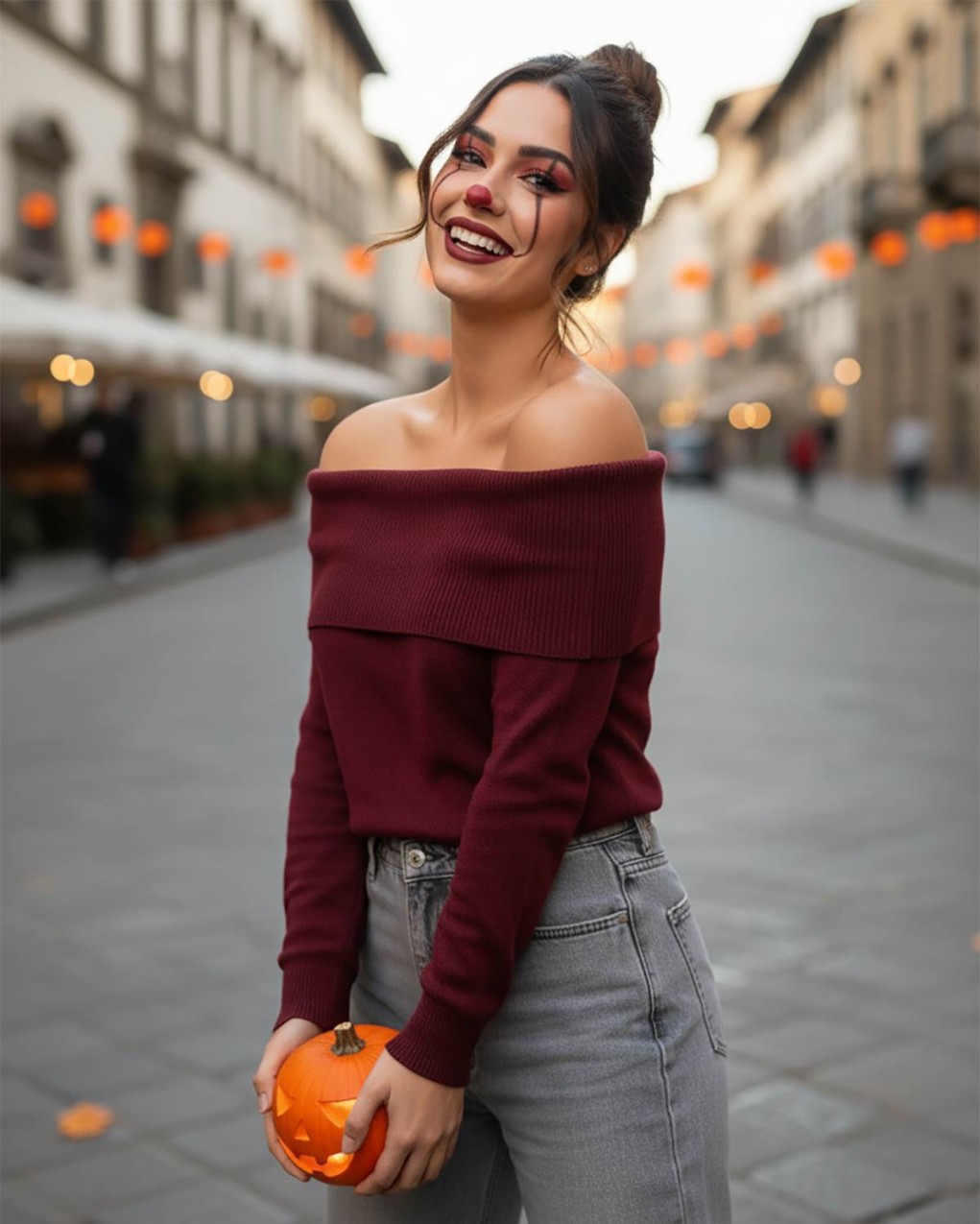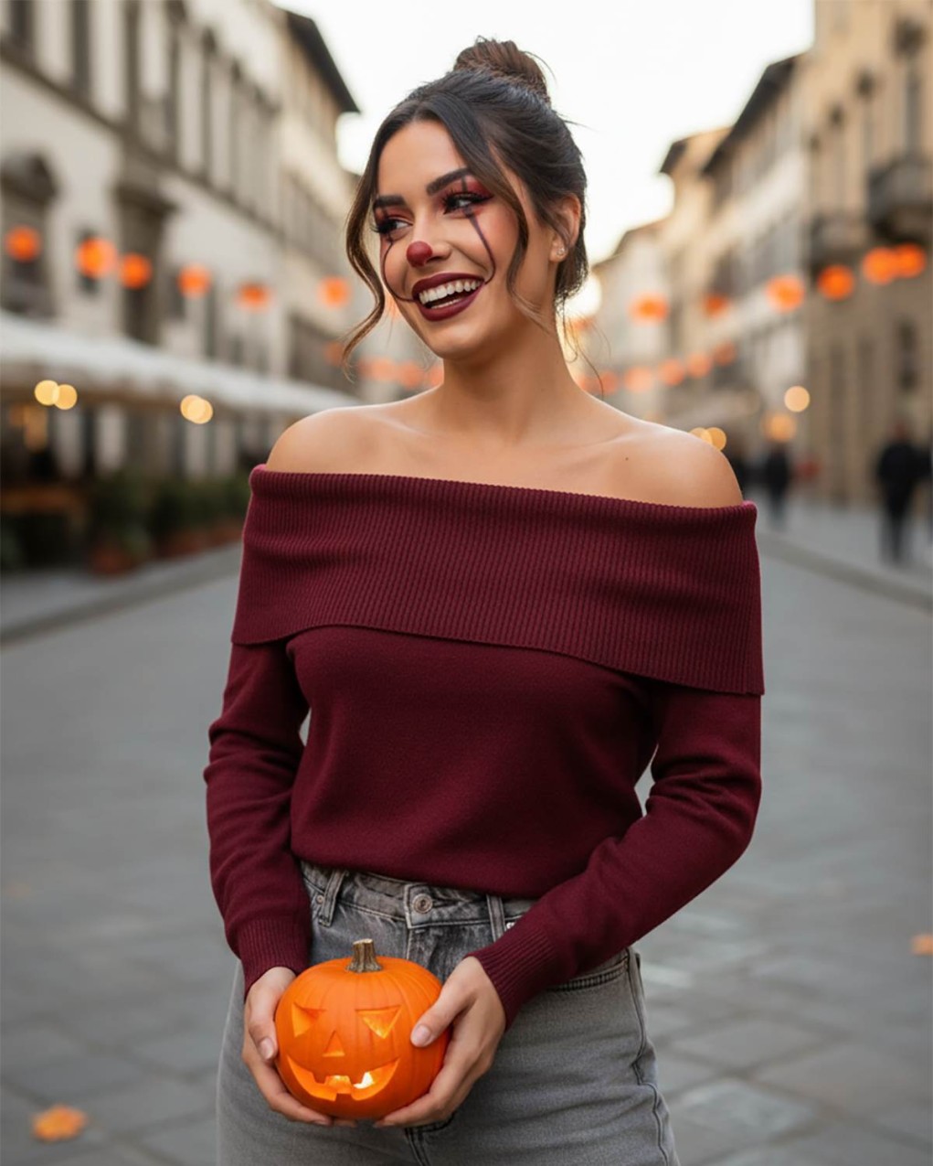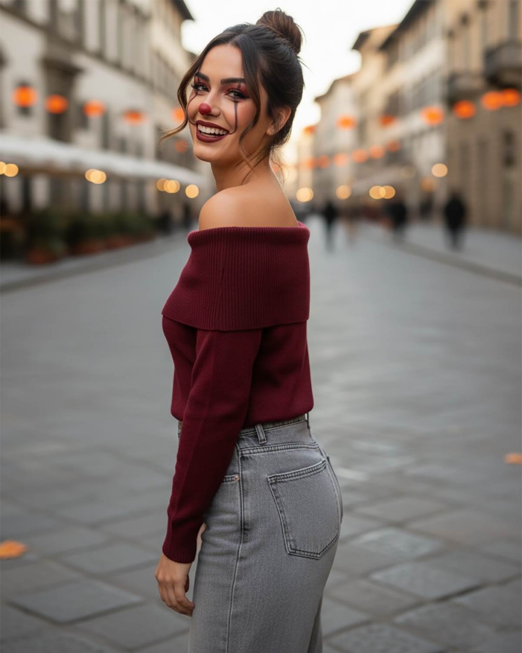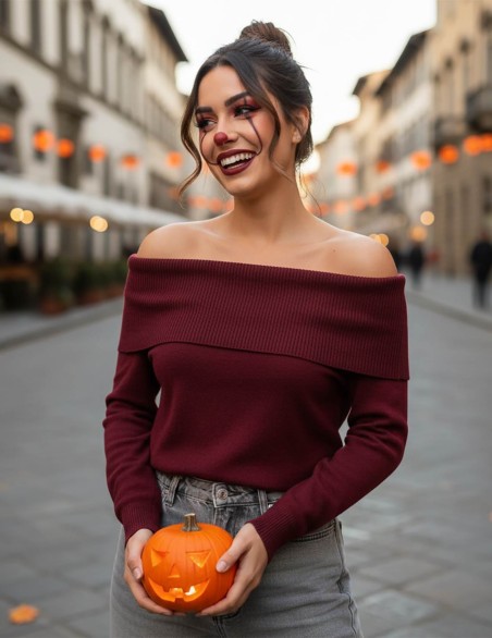 Maglione donna con scollo a barca off-shoulder dal design elegante e contemporaneo. Realizzato in morbido tessuto che garantisce comfort e morbidezza, con ampio collo ripiegato che può essere indossato sulle spalle per un look sofisticato. La vestibilità è regolare e aderente, perfetta per valorizzare la silhouette. Ideale per outfit casual-chic, si abbina facilmente a jeans o pantaloni per un look versatile da giorno o sera.