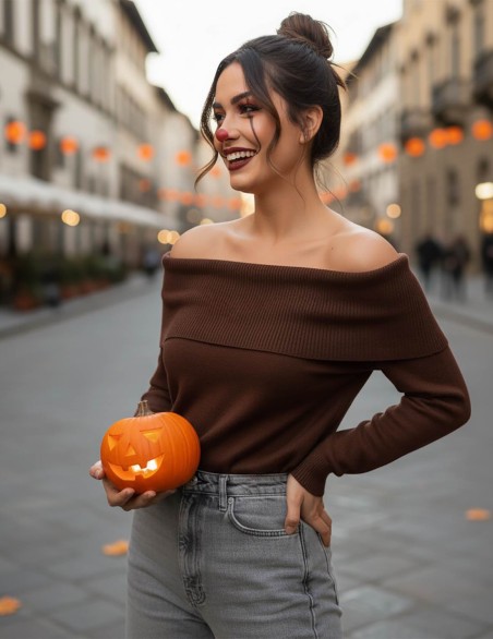 Maglione donna con scollo a barca off-shoulder dal design elegante e contemporaneo. Realizzato in morbido tessuto che garantisce comfort e morbidezza, con ampio collo ripiegato che può essere indossato sulle spalle per un look sofisticato. La vestibilità è regolare e aderente, perfetta per valorizzare la silhouette. Ideale per outfit casual-chic, si abbina facilmente a jeans o pantaloni per un look versatile da giorno o sera.