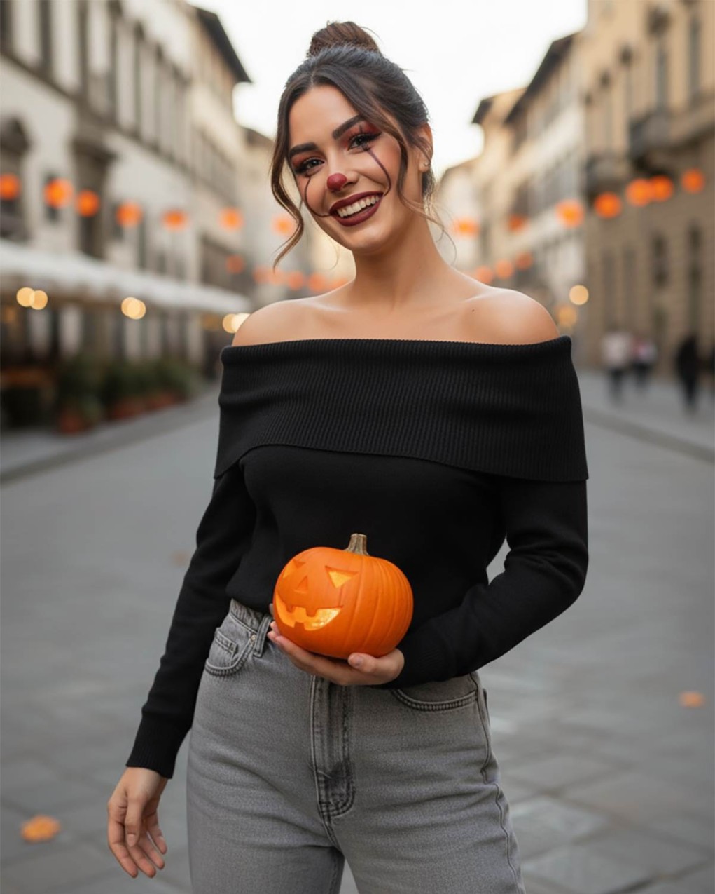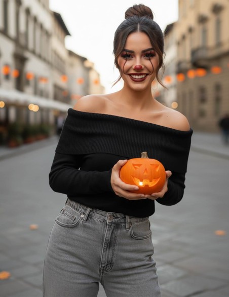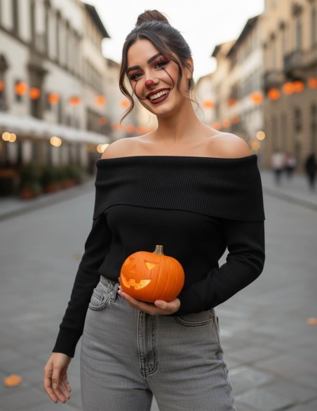 Maglione donna con scollo a barca off-shoulder dal design elegante e contemporaneo. Realizzato in morbido tessuto che garantisce comfort e morbidezza, con ampio collo ripiegato che può essere indossato sulle spalle per un look sofisticato. La vestibilità è regolare e aderente, perfetta per valorizzare la silhouette. Ideale per outfit casual-chic, si abbina facilmente a jeans o pantaloni per un look versatile da giorno o sera.