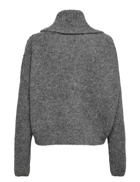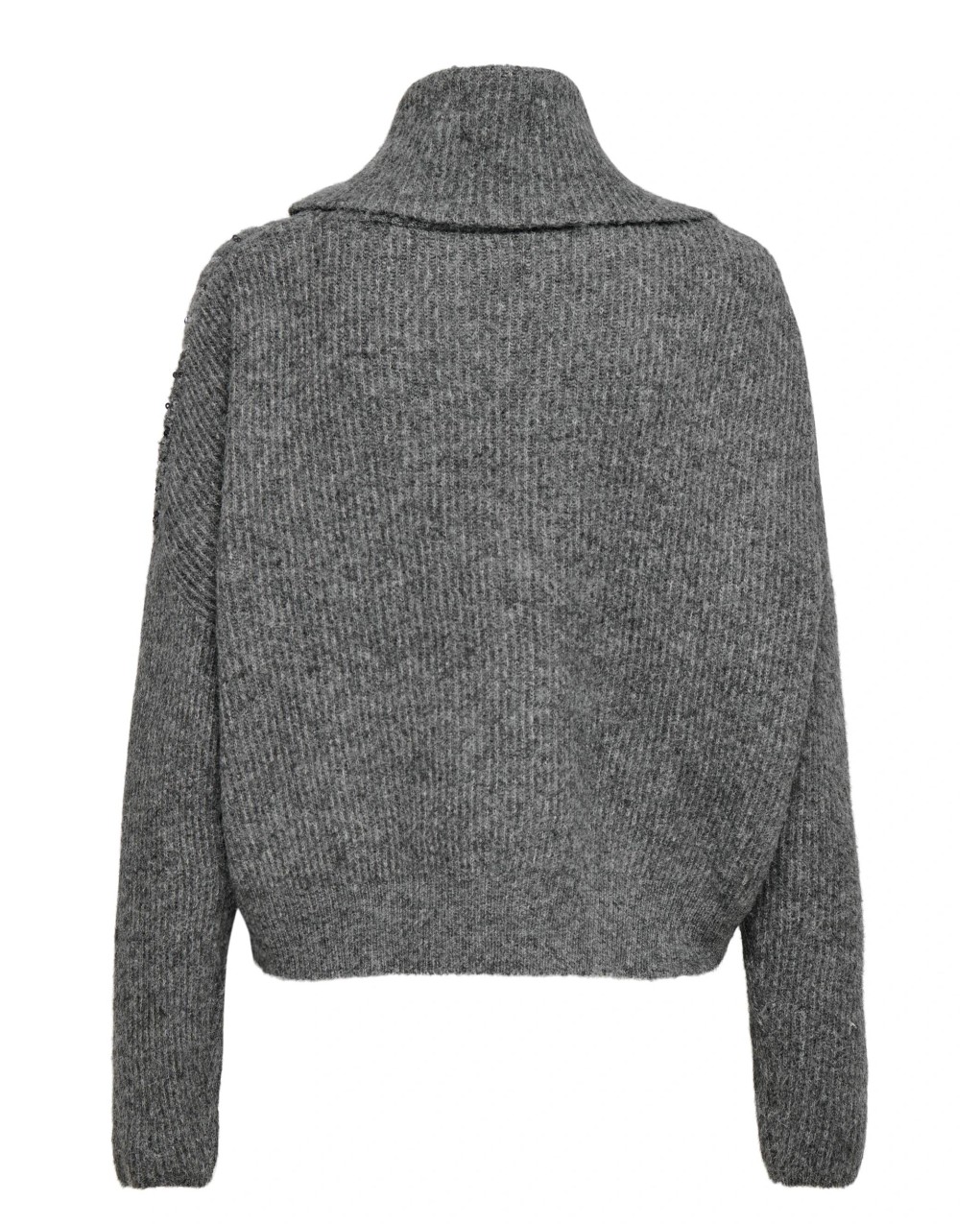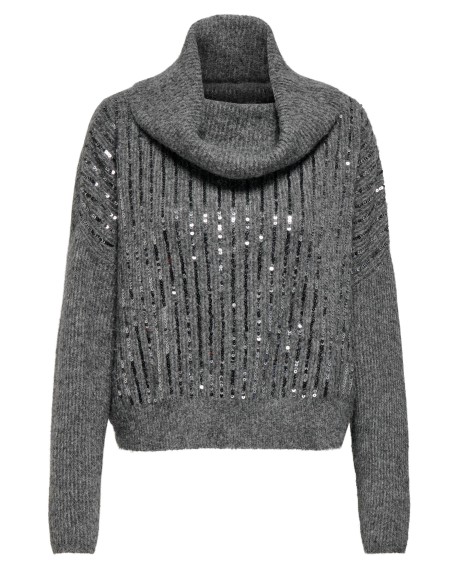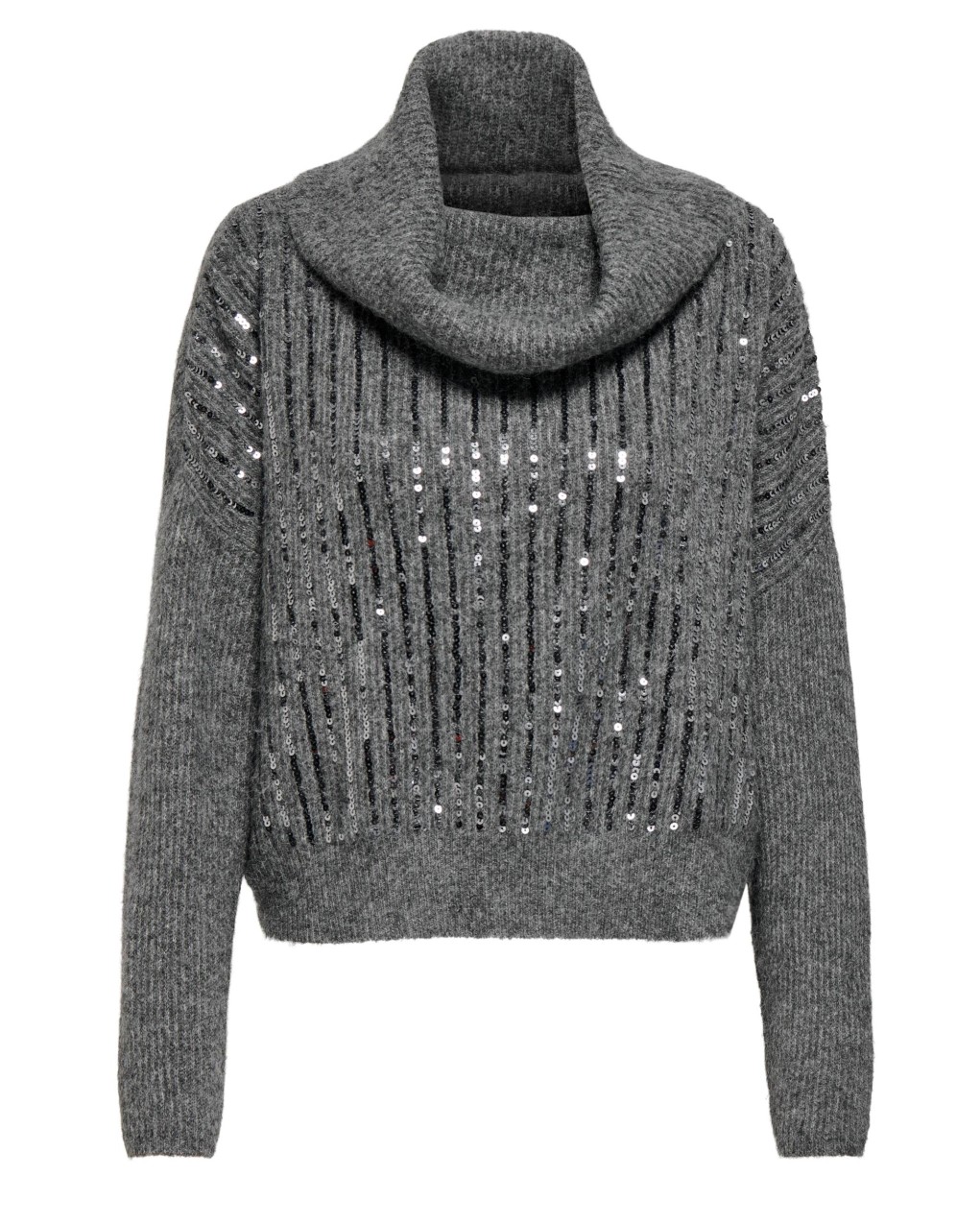 Maglione da donna in maglia con collo alto, caratterizzato da un elegante design con applicazioni di paillettes verticali sul davanti che donano un tocco glamour. Realizzato in morbida maglia lavorata a coste, offre comfort e calore per la stagione fredda. La vestibilità è comoda e rilassata, con maniche lunghe e lunghezza regolare che si adatta perfettamente a look casual-chic o serate eleganti.