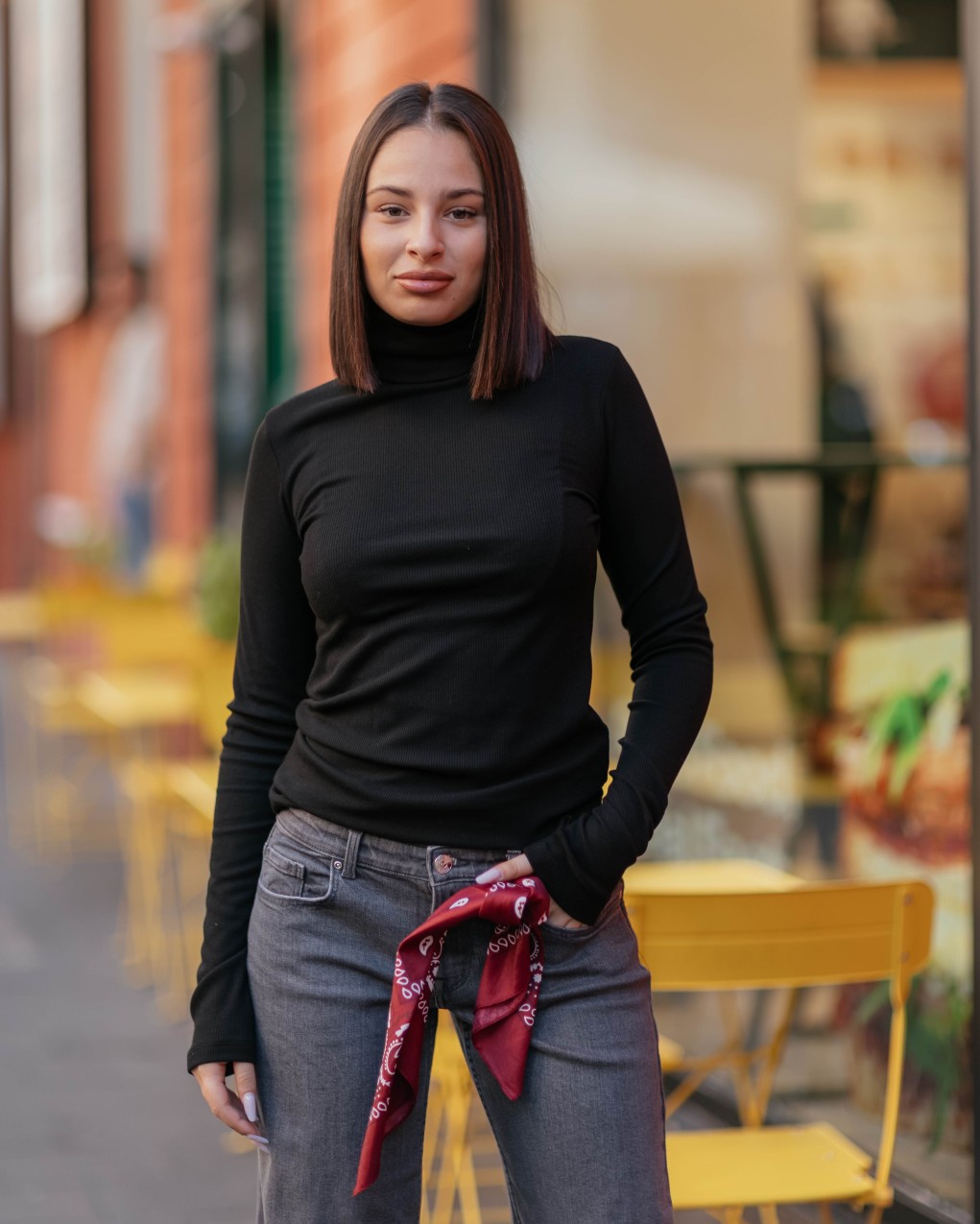 Maglia a collo alto da donna, ideale per un look casual-elegante durante la stagione fredda. Realizzata in tessuto stretch morbido e confortevole, offre una vestibilità aderente che valorizza la silhouette. Le maniche lunghe e il collo alto garantiscono calore e protezione, mentre la texture a coste aggiunge un tocco di stile contemporaneo. Perfetta da abbinare a jeans o pantaloni per outfit quotidiani versatili.
