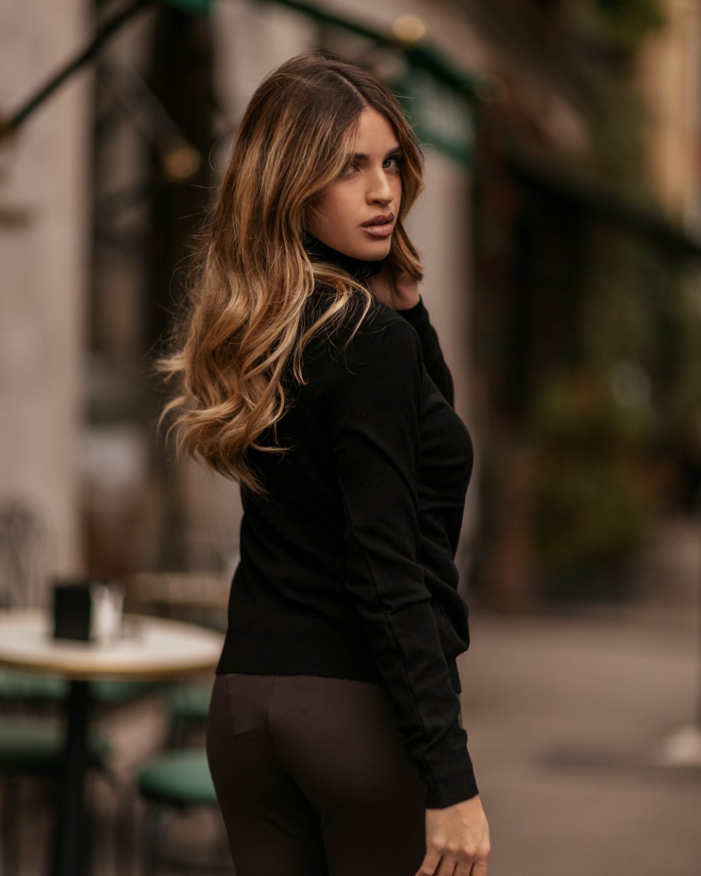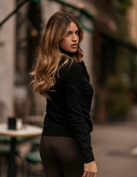 Elegante maglia a collo alto in morbido tessuto stretch, ideale per un look sofisticato e contemporaneo. Presenta maniche lunghe e una silhouette aderente che valorizza la figura femminile con classe. Realizzata in materiale confortevole e traspirante, garantisce vestibilità slim-fit perfetta per essere indossata da sola o sotto giacche e blazer. Un capo versatile essenziale per il guardaroba autunno-inverno.