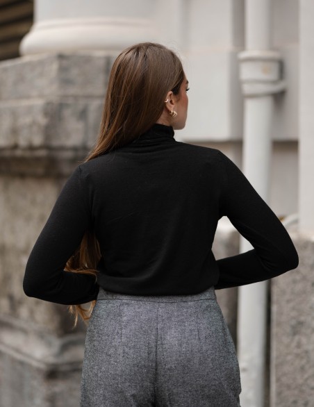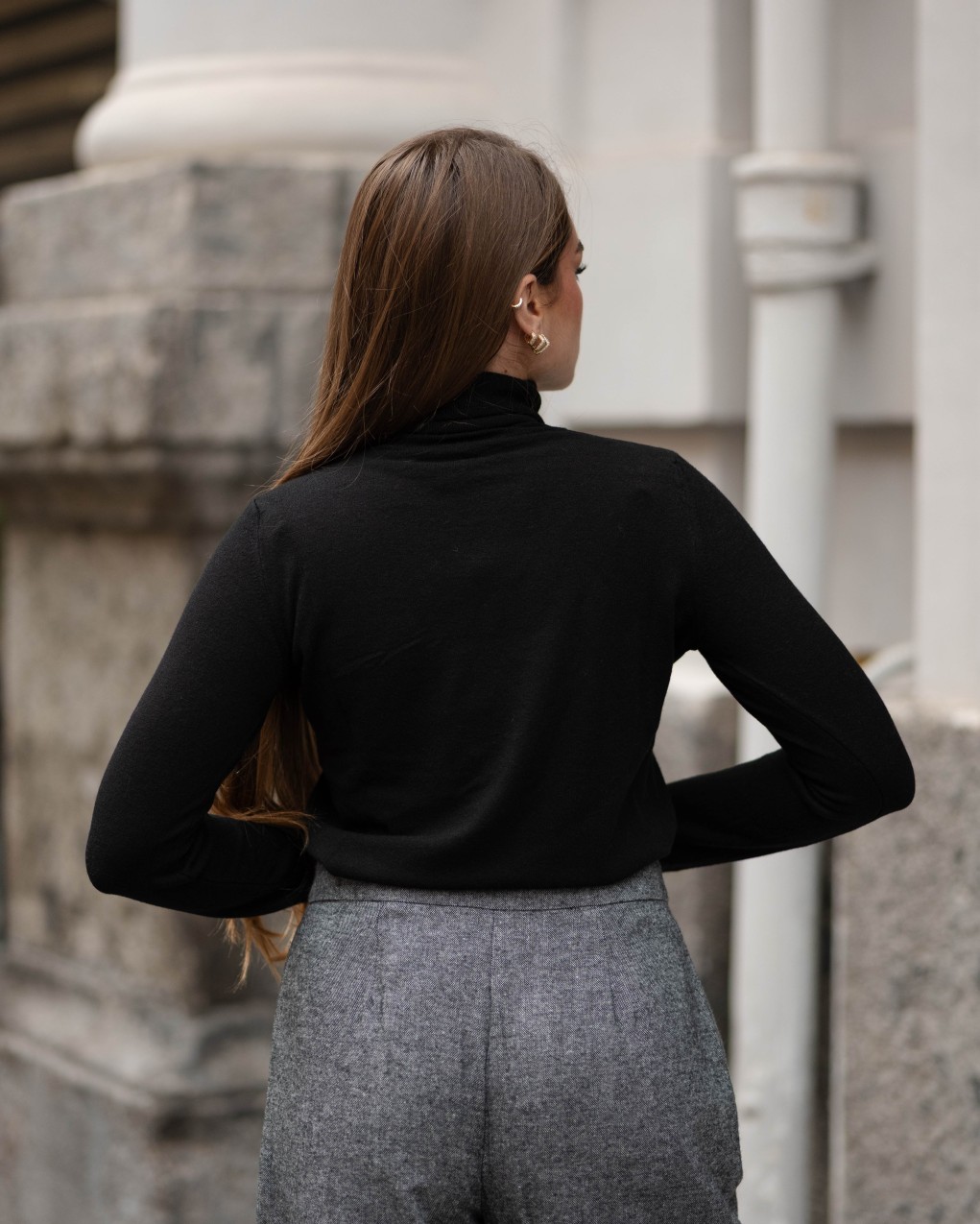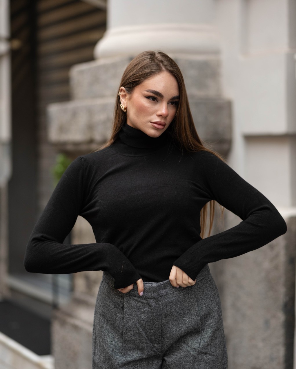 Elegante maglia a collo alto in morbido tessuto stretch, ideale per un look sofisticato e contemporaneo. Presenta maniche lunghe e una silhouette aderente che valorizza la figura femminile con classe. Realizzata in materiale confortevole e traspirante, garantisce vestibilità slim-fit perfetta per essere indossata da sola o sotto giacche e blazer. Un capo versatile essenziale per il guardaroba autunno-inverno.