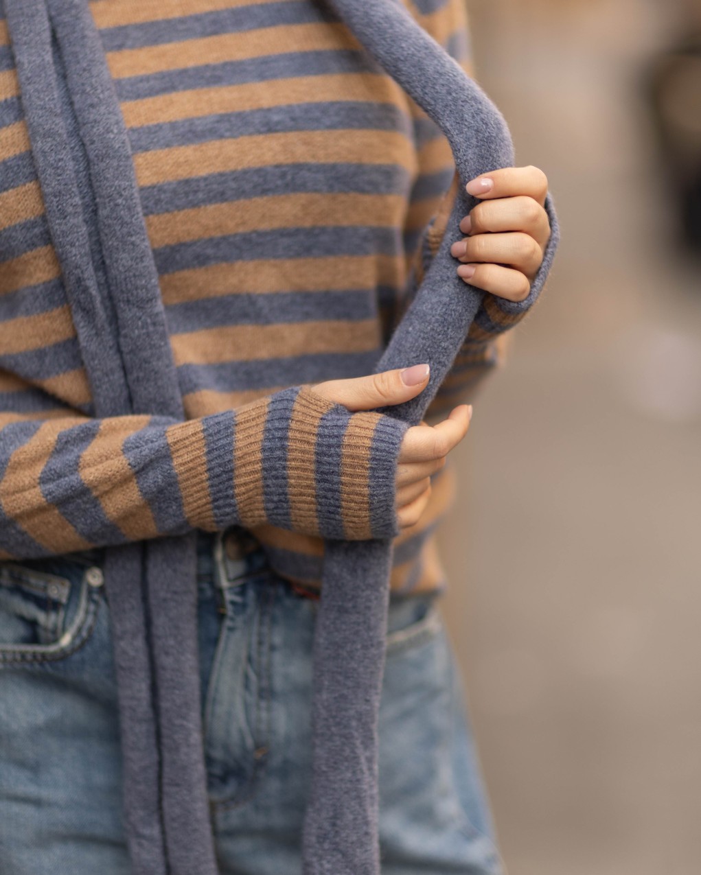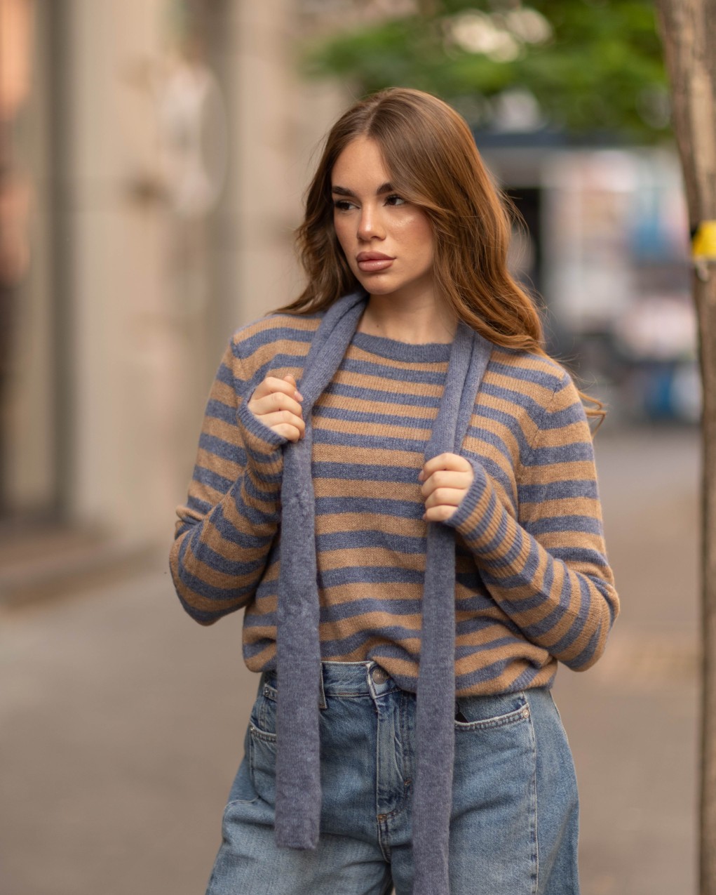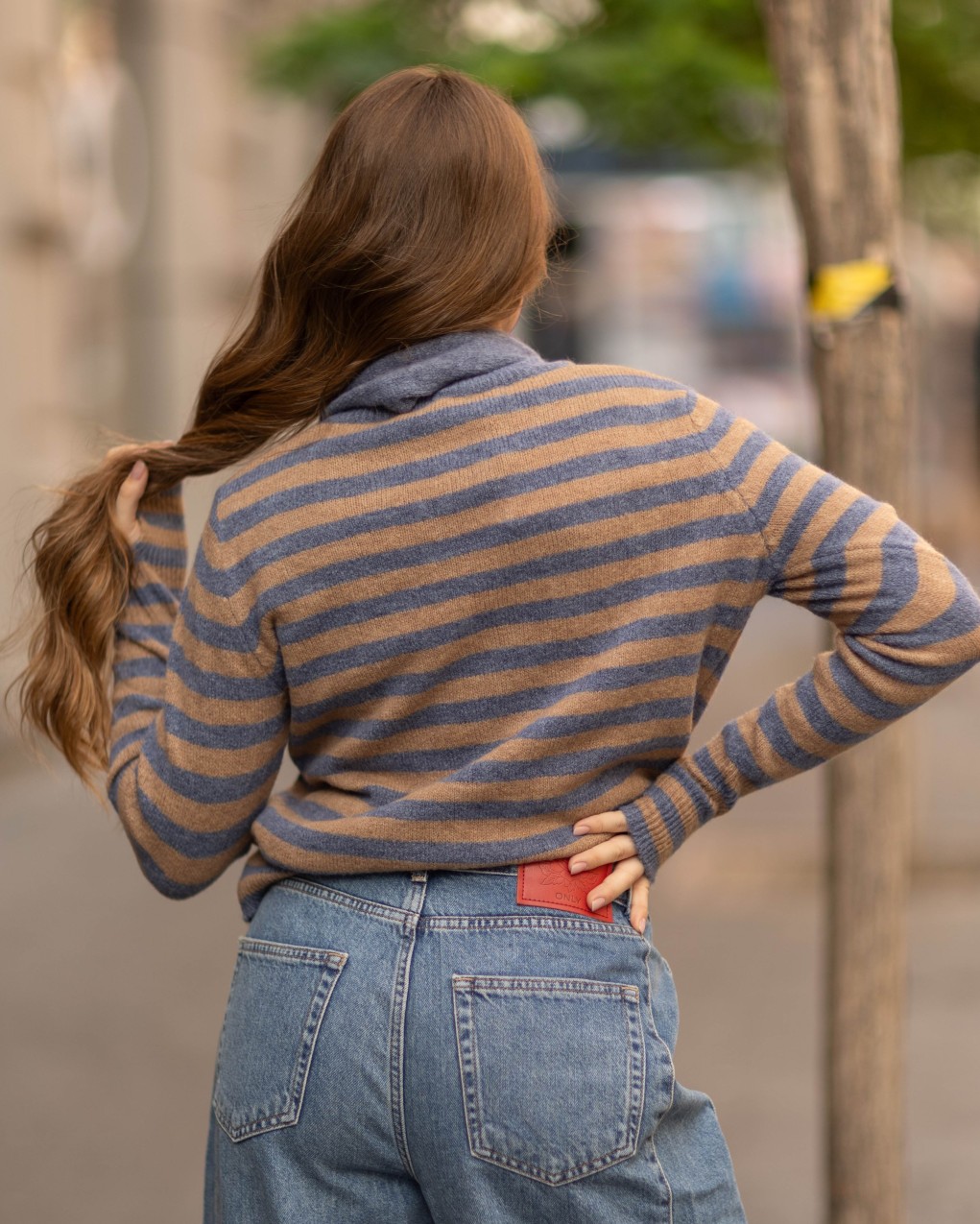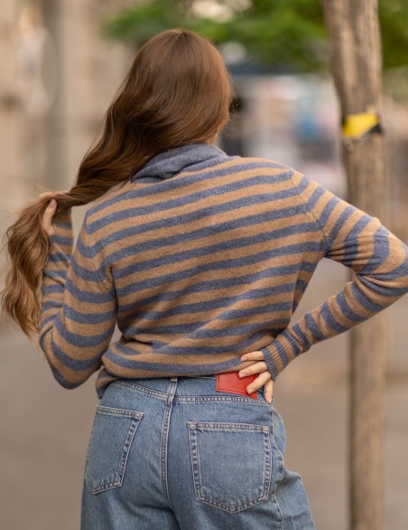 Maglia a collo alto in stile marinière con pattern a righe orizzontali, perfetta per un look casual-chic d'ispirazione parigina. Realizzata in morbido tessuto a maglia, presenta maniche lunghe e vestibilità regular che garantisce comfort e libertà di movimento. Il design classico a righe si abbina facilmente a jeans e pantaloni per outfit quotidiani versatili. Capo essenziale per la stagione autunno-inverno, ideale da indossare da solo o sotto giacche e cappotti.