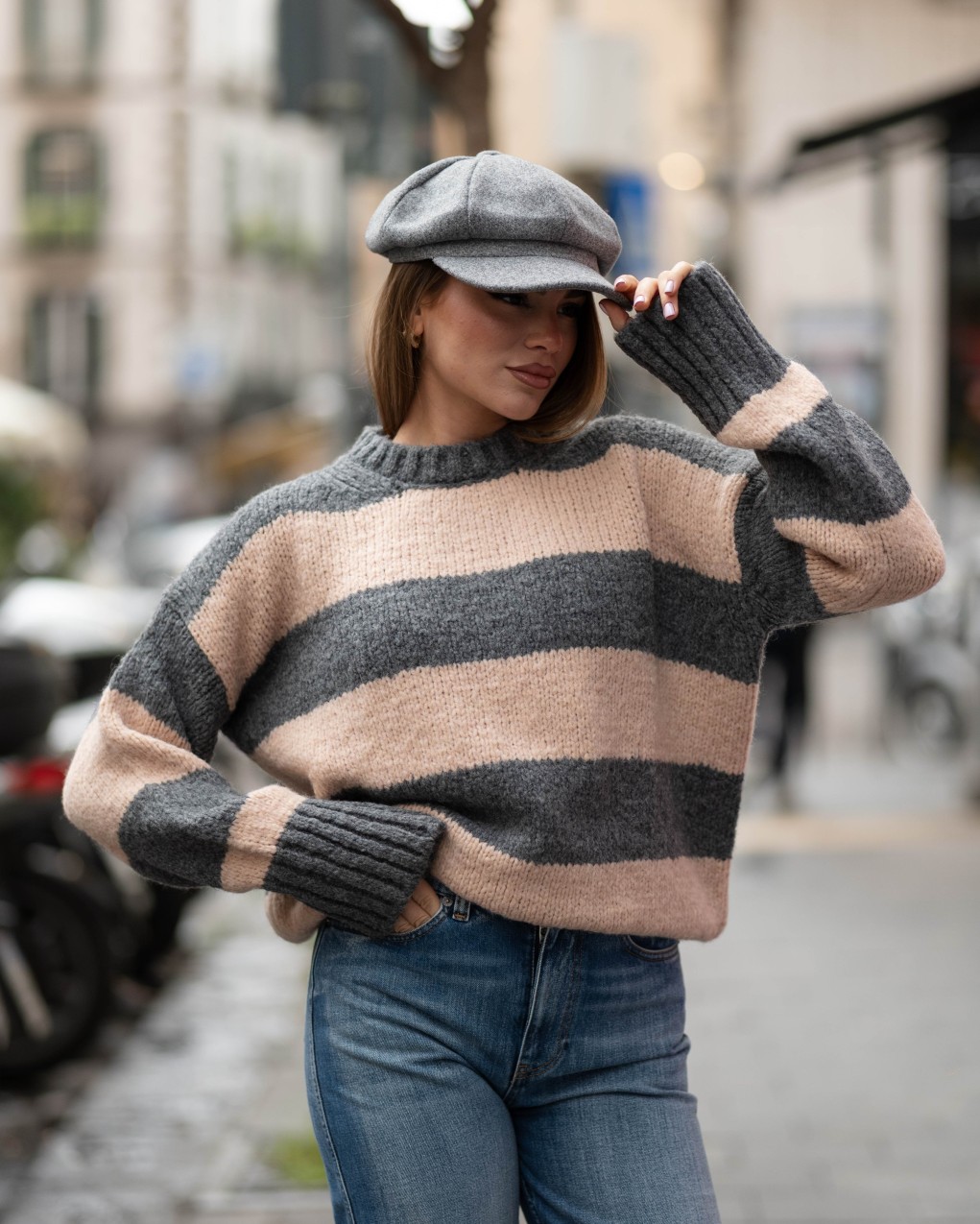 Maglione a righe dallo stile casual-chic, perfetto per la stagione fredda. Realizzato in morbida maglia con motivo a righe orizzontali, presenta girocollo classico, maniche lunghe con polsini a coste e texture calda e avvolgente. La vestibilità è comoda e rilassata, con lunghezza che arriva al punto vita, ideale da abbinare a jeans o pantaloni per un look quotidiano versatile ed elegante.
