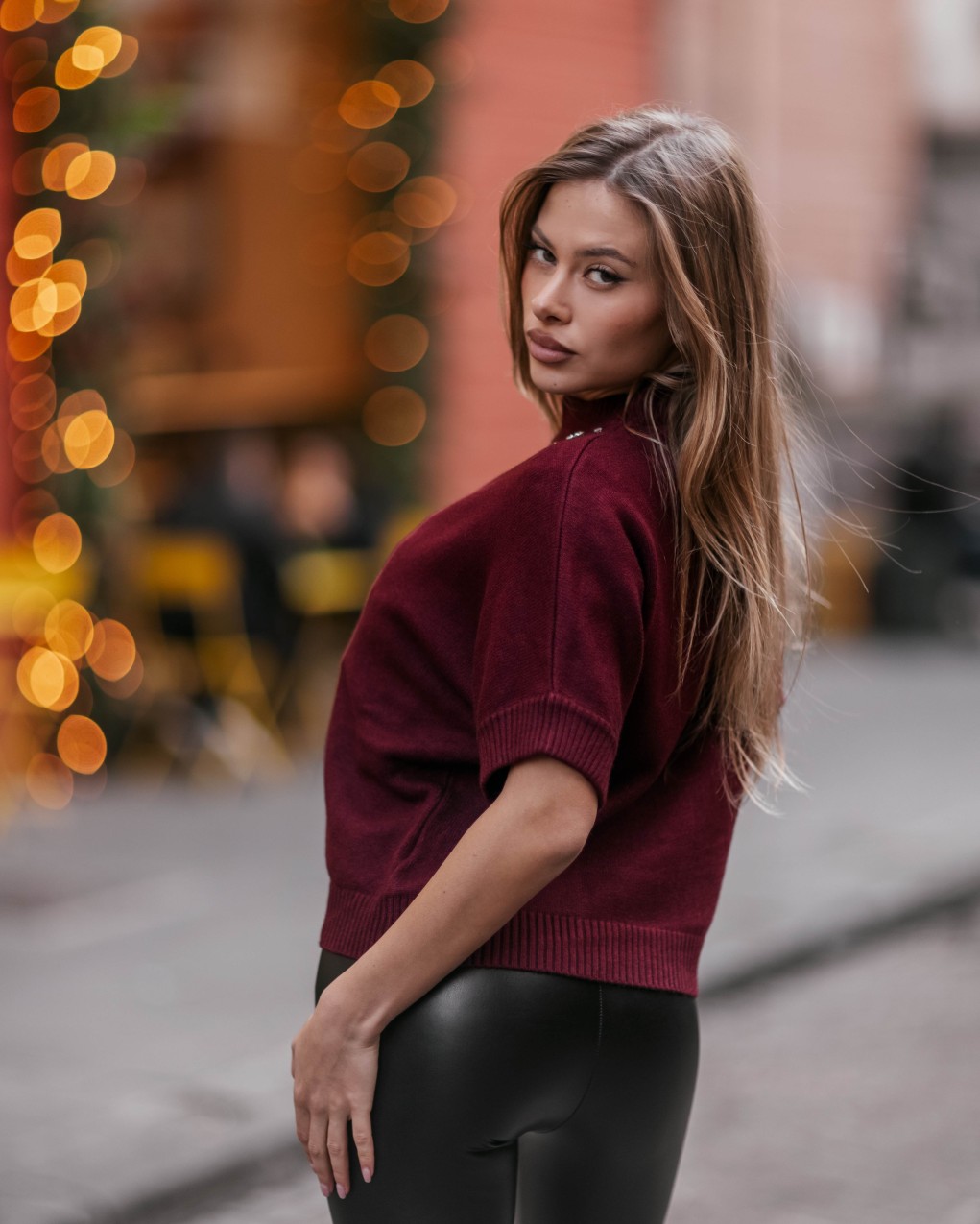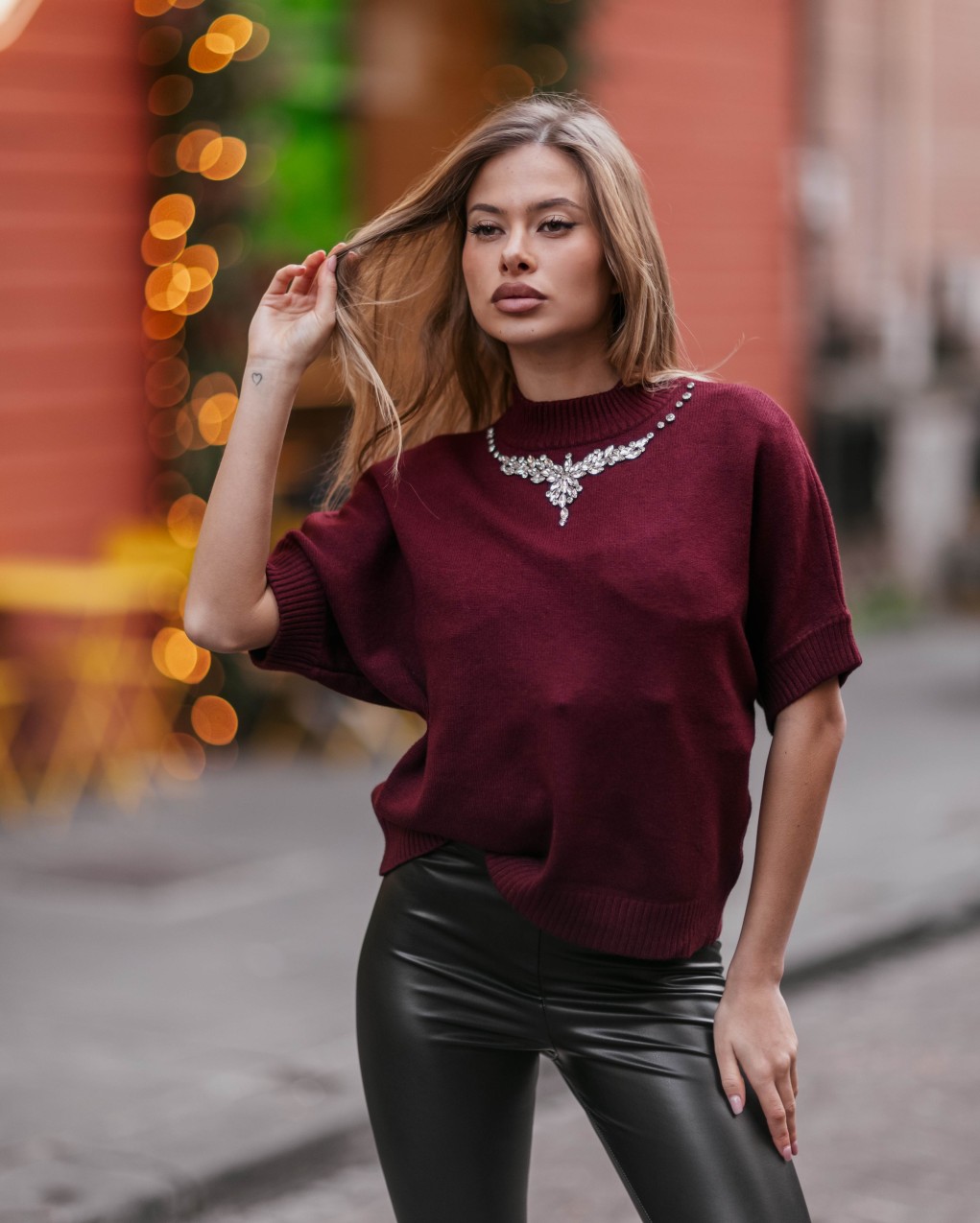 Maglia in maglia a maniche corte dallo stile elegante e raffinato, impreziosita da un'applicazione di strass e cristalli decorativi sulla scollatura. Realizzata in morbido tessuto lavorato a maglia con collo alto e dettagli a coste su polsini e orlo. La vestibilità è comoda e rilassata, perfetta per un look casual-chic da giorno o da sera. Capo versatile ideale per valorizzare outfit contemporanei con un tocco di glamour.