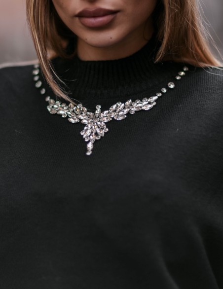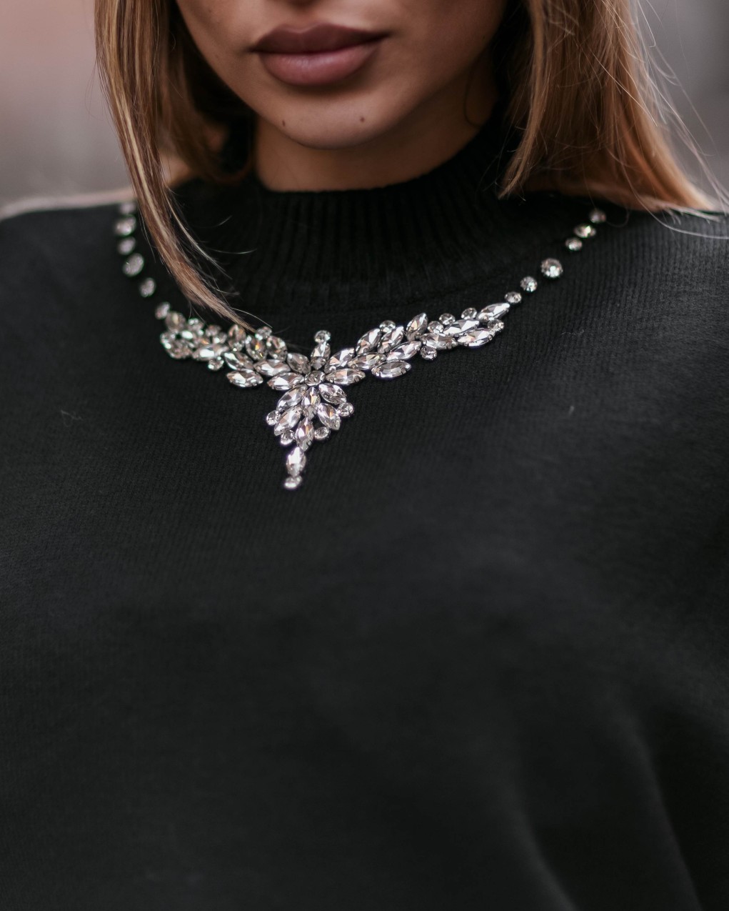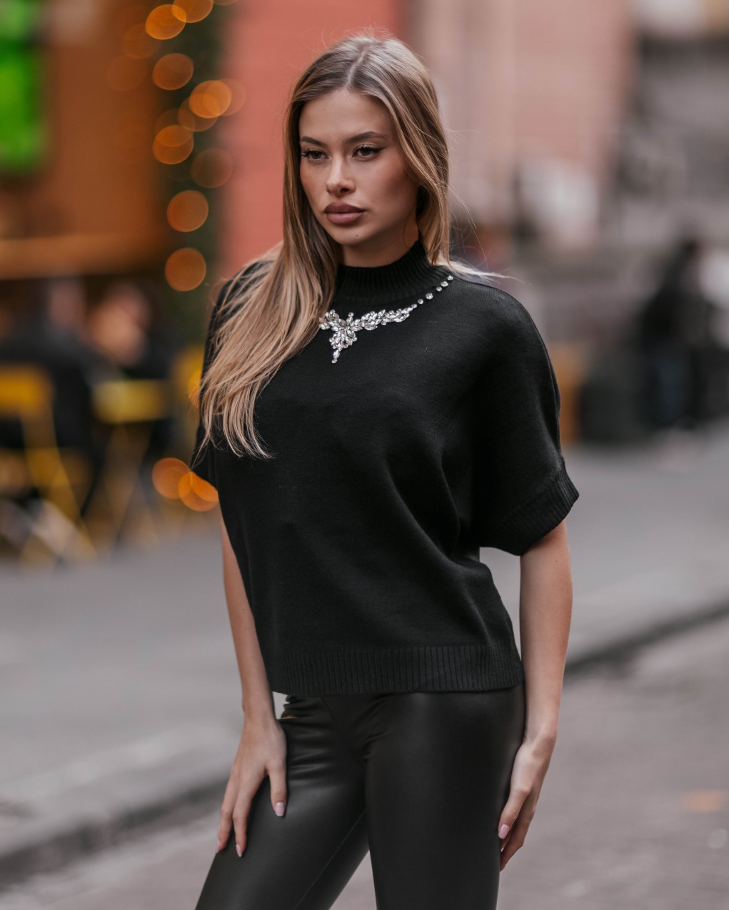 Maglia in maglia a maniche corte dallo stile elegante e raffinato, impreziosita da un'applicazione di strass e cristalli decorativi sulla scollatura. Realizzata in morbido tessuto lavorato a maglia con collo alto e dettagli a coste su polsini e orlo. La vestibilità è comoda e rilassata, perfetta per un look casual-chic da giorno o da sera. Capo versatile ideale per valorizzare outfit contemporanei con un tocco di glamour.