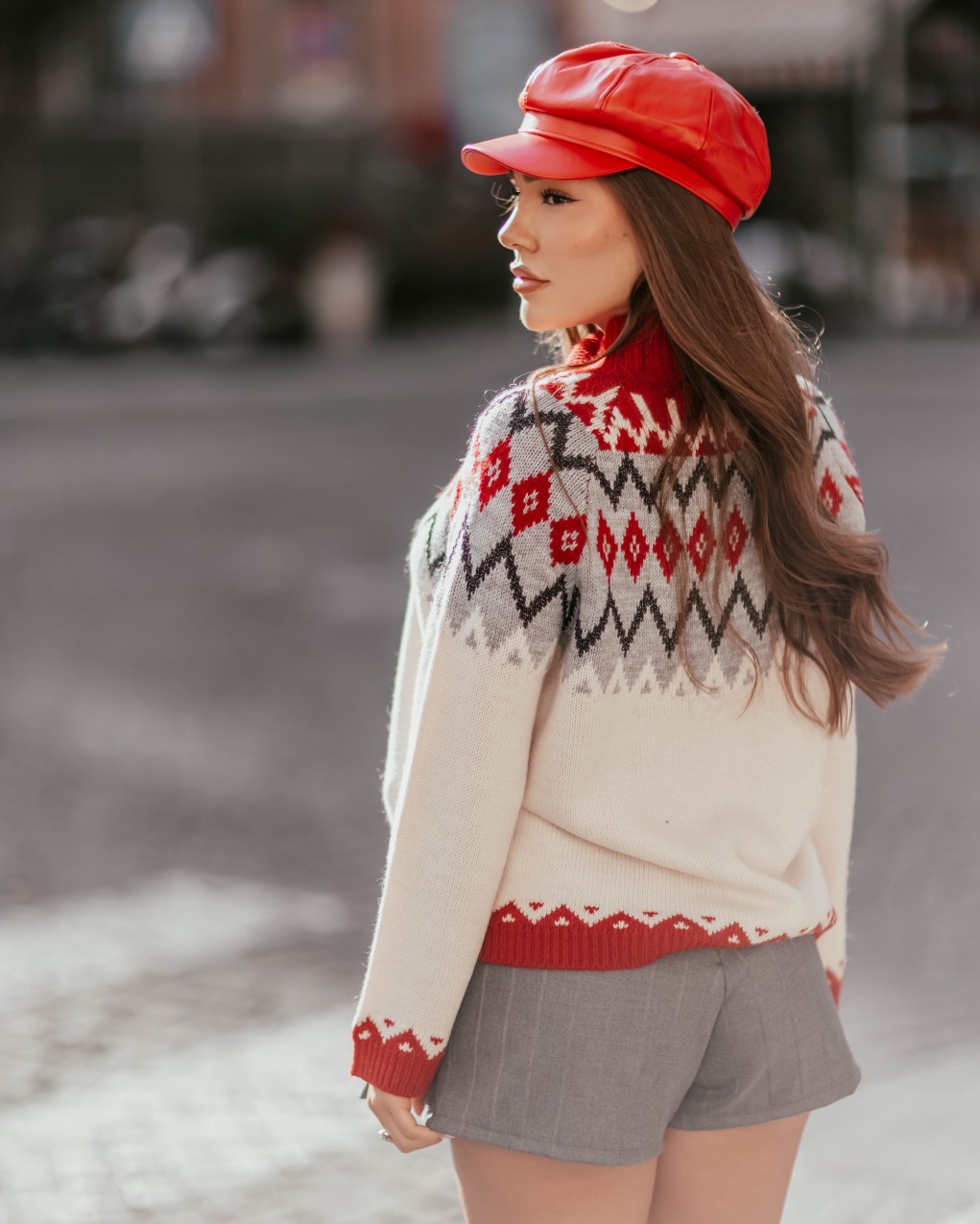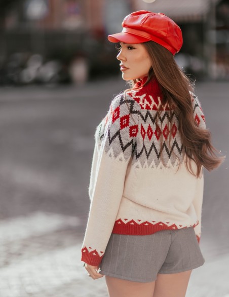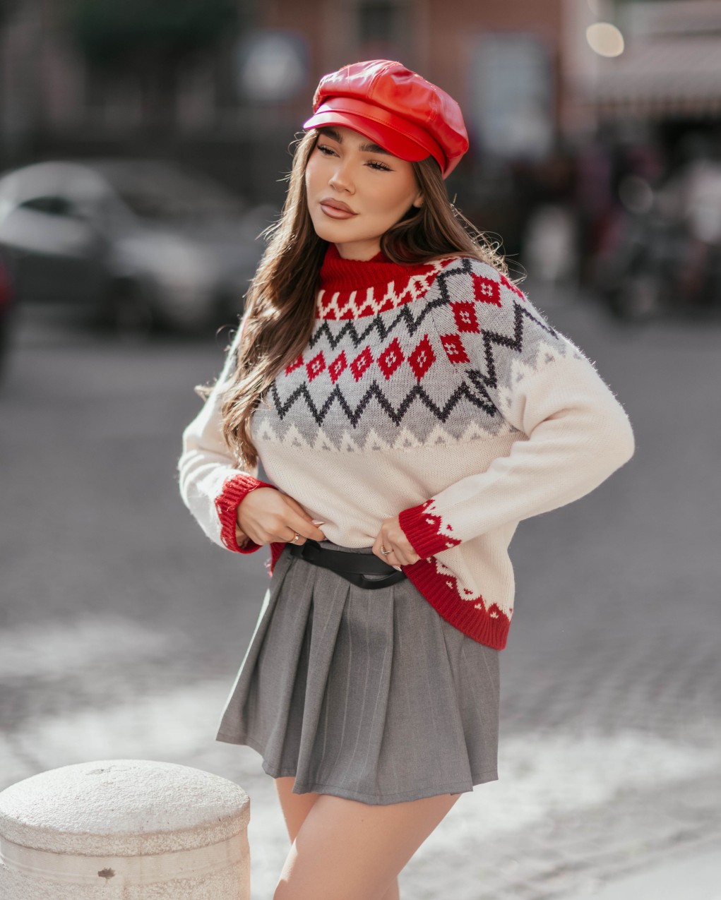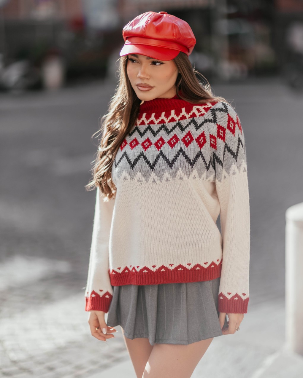 Maglione in maglia con motivo Fair Isle nordico, perfetto per la stagione invernale. Realizzato in filato morbido e caldo, presenta un elegante motivo geometrico jacquard sul girocollo, sulle spalle e sui polsini a costine. Il design combina tradizione e modernità con una vestibilità regular comfort, ideale per outfit casual-chic. Capo versatile che garantisce calore e stile per ogni occasione quotidiana.
