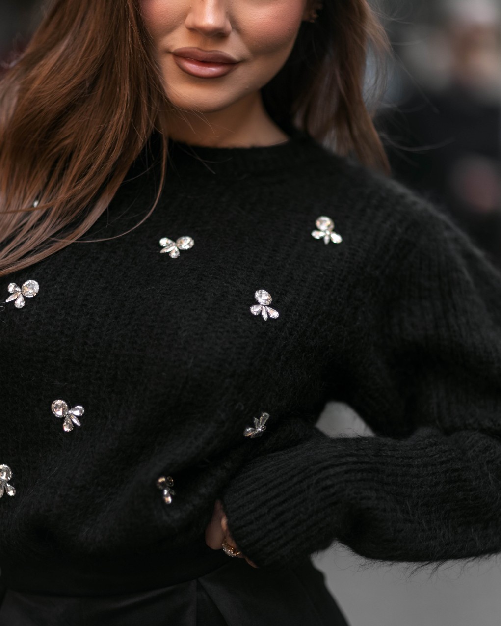 Maglione elegante da donna in morbida maglia con girocollo e maniche lunghe a palloncino. Realizzato in filato pregiato, presenta raffinati dettagli gioiello applicati sul davanti che aggiungono un tocco di luminosità e glamour. La vestibilità è regolare e confortevole, perfetta per outfit casual-chic o eleganti. Ideale da abbinare a pantaloni o gonne per creare look sofisticati in ogni stagione.