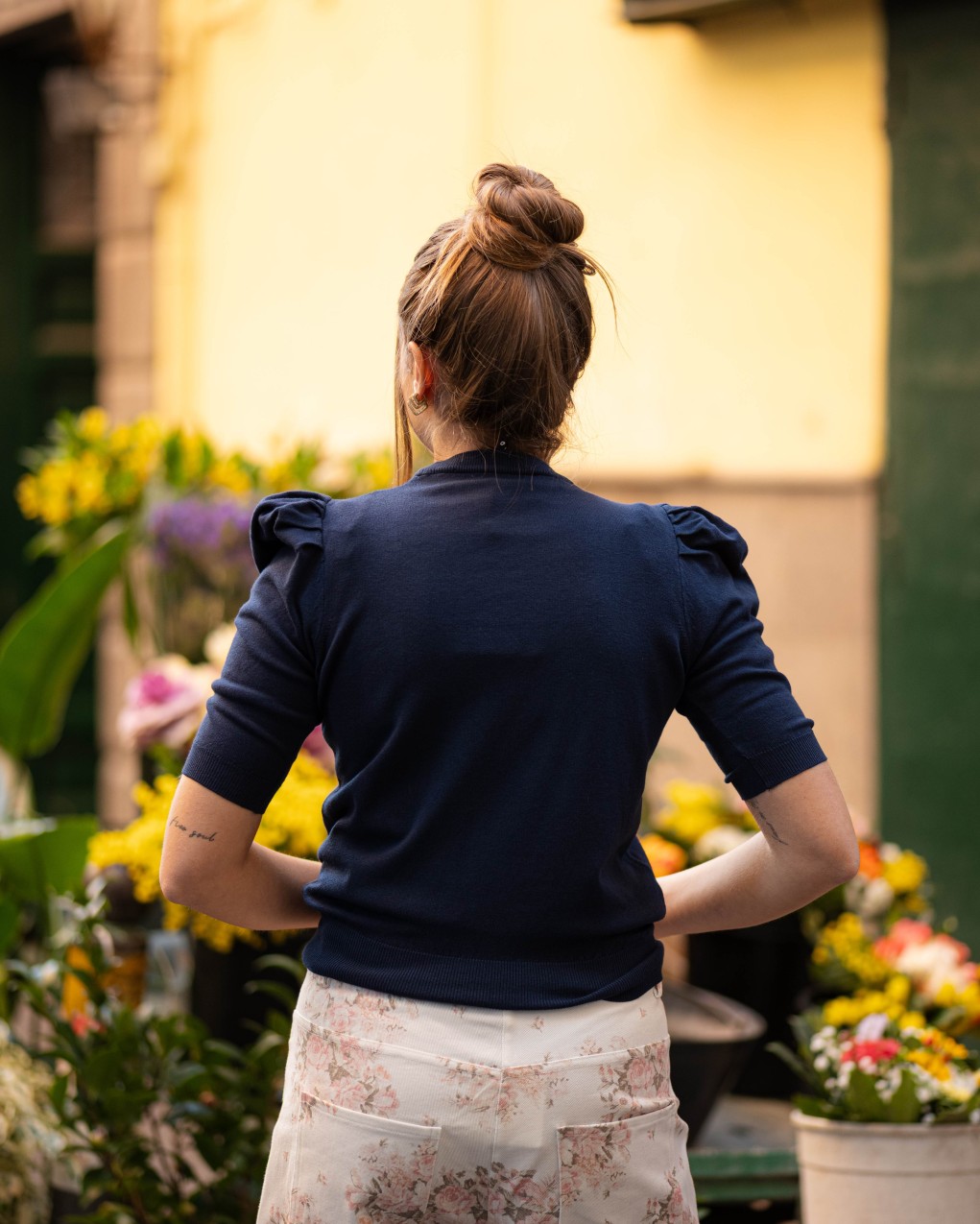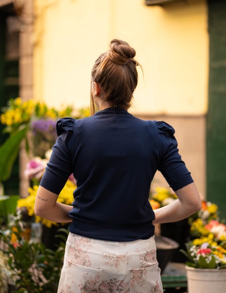 Maglia a maniche corte dallo stile contemporaneo ed elegante, caratterizzata da voluminose maniche a sbuffo che conferiscono un tocco sofisticato e femminile. Realizzata in maglia fine con girocollo, offre una vestibilità aderente che valorizza la silhouette. Il design versatile la rende perfetta sia per look casual che per occasioni più formali, abbinabile facilmente a pantaloni e gonne di ogni tipo.