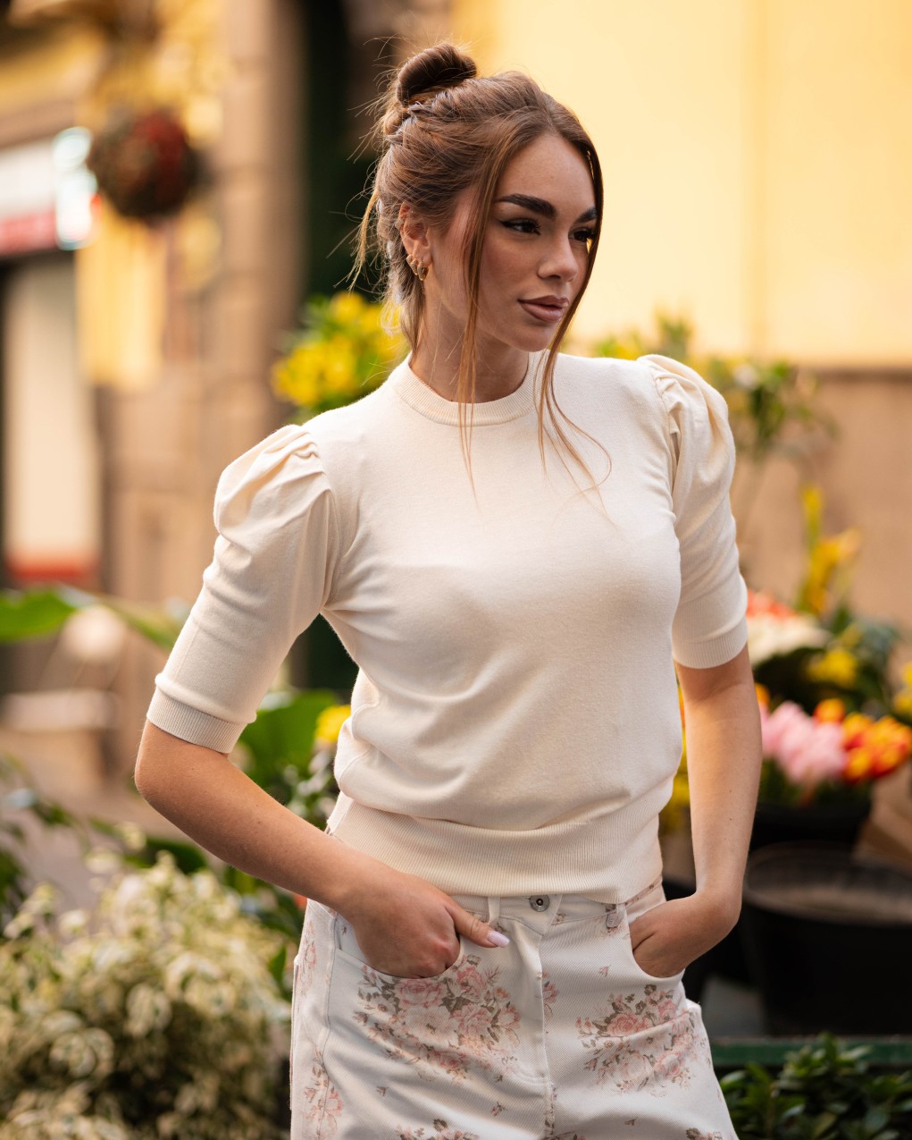 Maglia a maniche corte dallo stile contemporaneo ed elegante, caratterizzata da voluminose maniche a sbuffo che conferiscono un tocco sofisticato e femminile. Realizzata in maglia fine con girocollo, offre una vestibilità aderente che valorizza la silhouette. Il design versatile la rende perfetta sia per look casual che per occasioni più formali, abbinabile facilmente a pantaloni e gonne di ogni tipo.