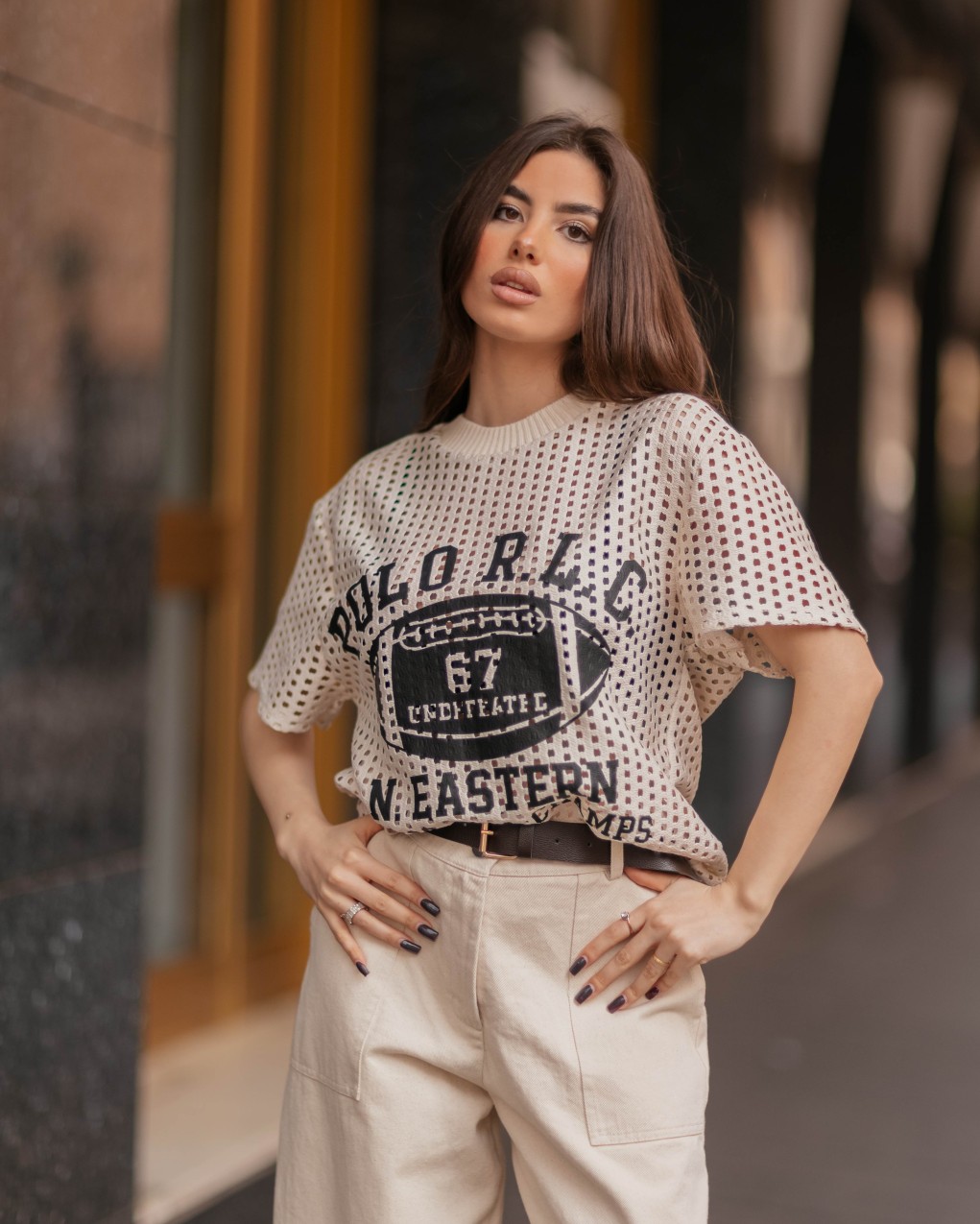 T-shirt sportiva dallo stile college con grafica stampata sul davanti che raffigura un pallone da football americano e lettering "COLORADO 67 CONFEDERATE N.EASTERN CHAMPS". Realizzata in tessuto traforato mesh che garantisce massima traspirabilità e un look originale e di tendenza. Il capo presenta vestibilità regolare con girocollo e maniche corte, perfetto da indossare sopra un top base per un outfit casual-sportivo contemporaneo. Ideale per completare look rilassati con un tocco urban-chic.
