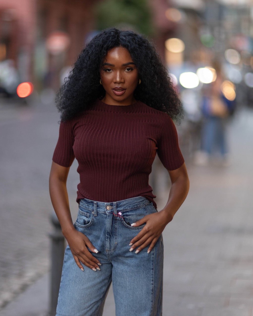 Maglietta a costine in morbido tessuto elasticizzato con maniche corte e vestibilità aderente. Il design minimalista e la silhouette moderna la rendono perfetta per look casual-chic. La lavorazione a coste e il taglio crop donano un tocco contemporaneo a questo capo versatile, ideale da abbinare con jeans e gonne.