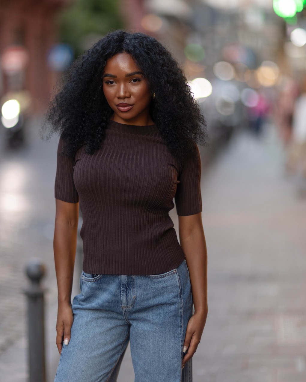 Maglietta a costine in morbido tessuto elasticizzato con maniche corte e vestibilità aderente. Il design minimalista e la silhouette moderna la rendono perfetta per look casual-chic. La lavorazione a coste e il taglio crop donano un tocco contemporaneo a questo capo versatile, ideale da abbinare con jeans e gonne.